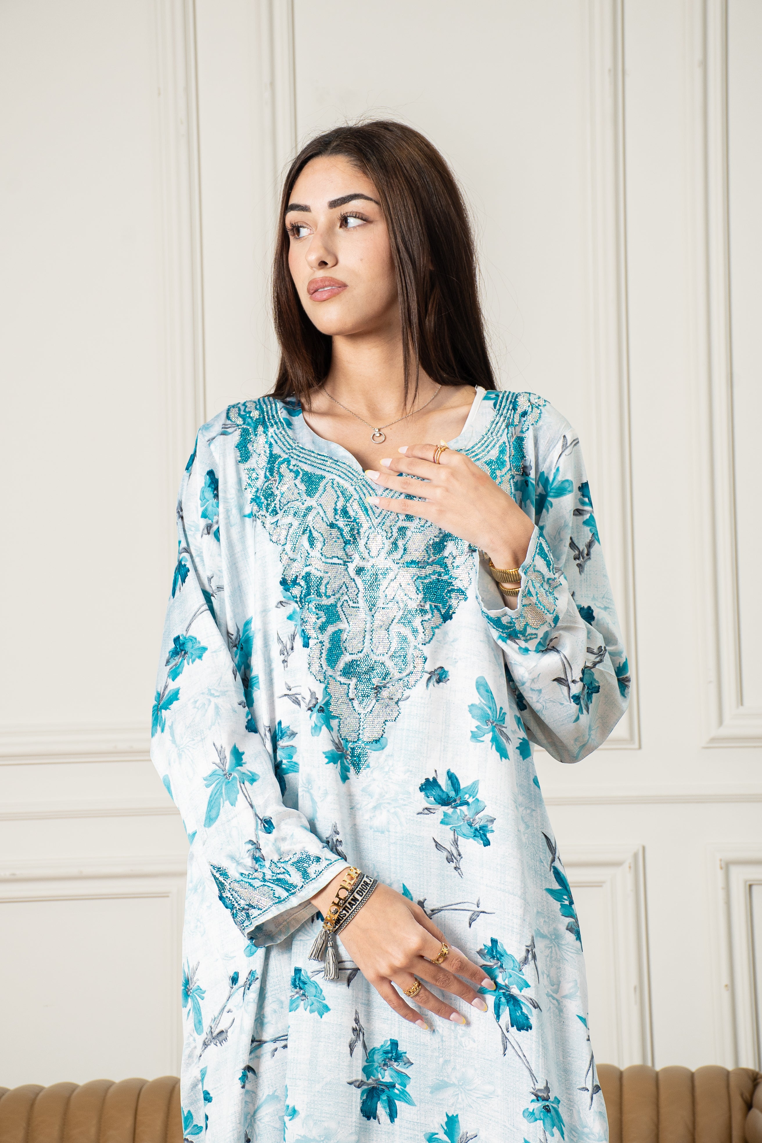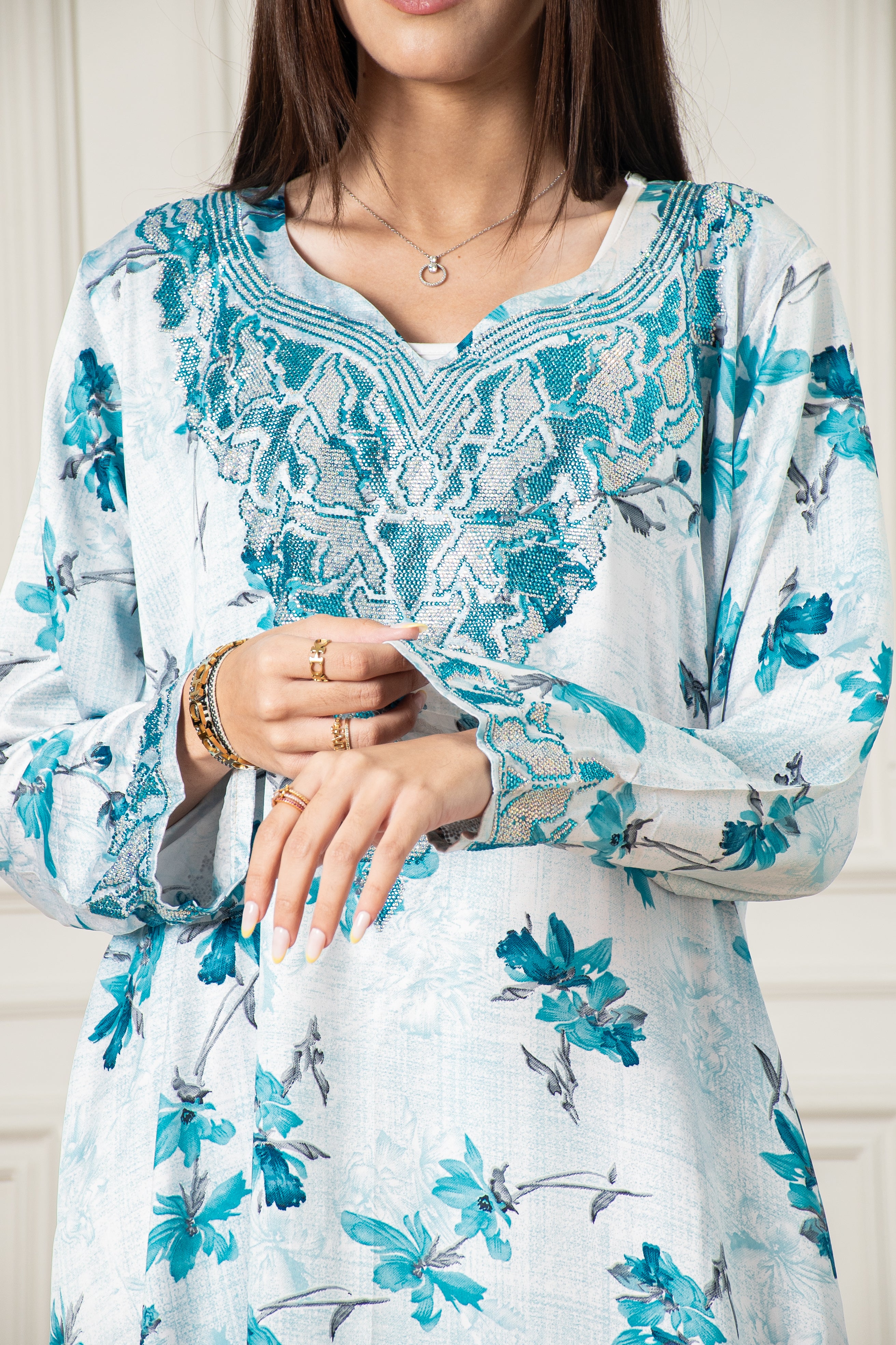 Enjoy a touch of elegance with our Blossom Mukhawara in Turquoise. Made from soft, flowing fabric with pretty floral embroidery, it’s comfortable to wear at home or under an Abaya. The relaxed fit keeps you comfortable while looking nice. Add simple accessories for a traditional yet modern look.