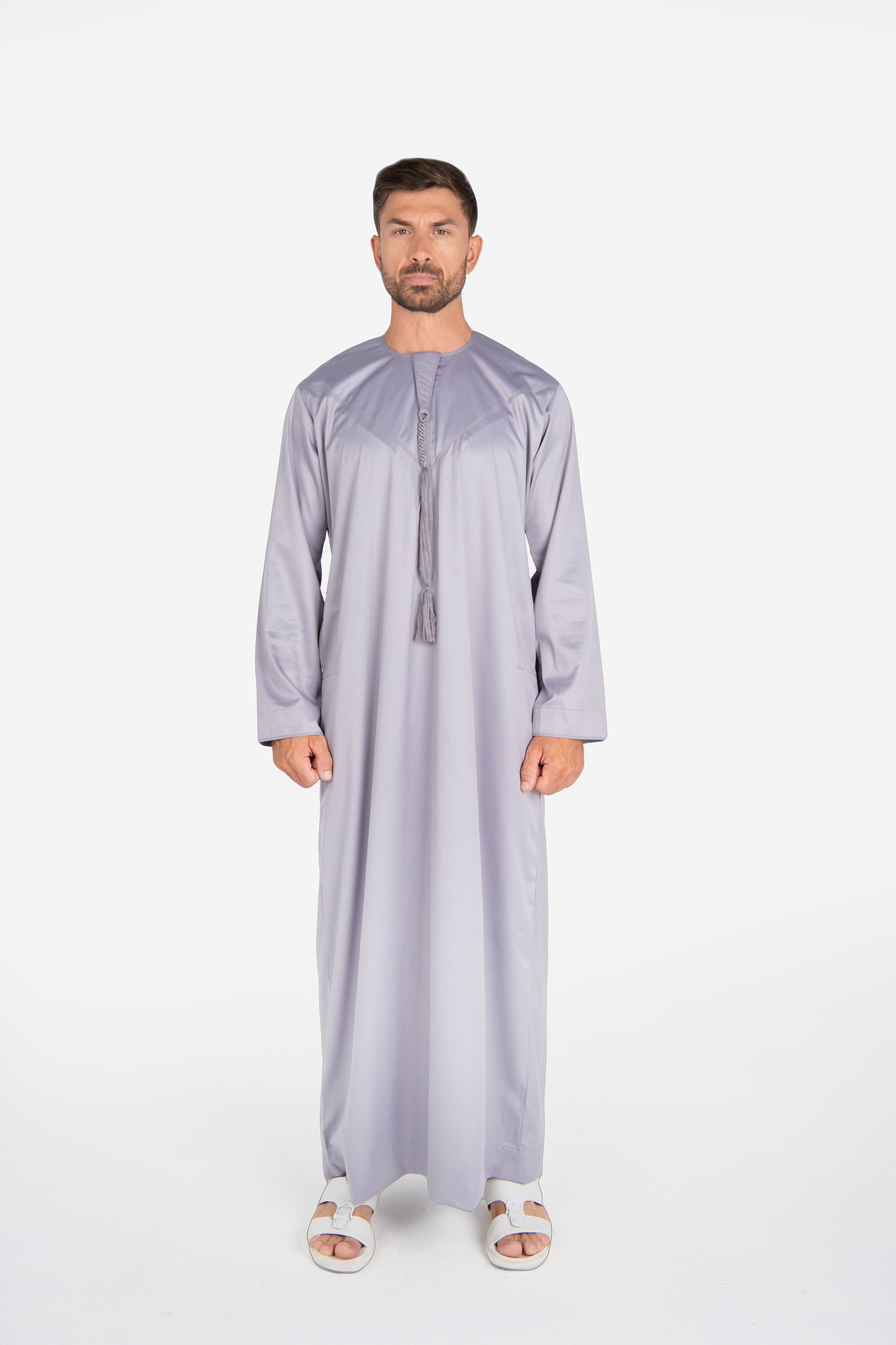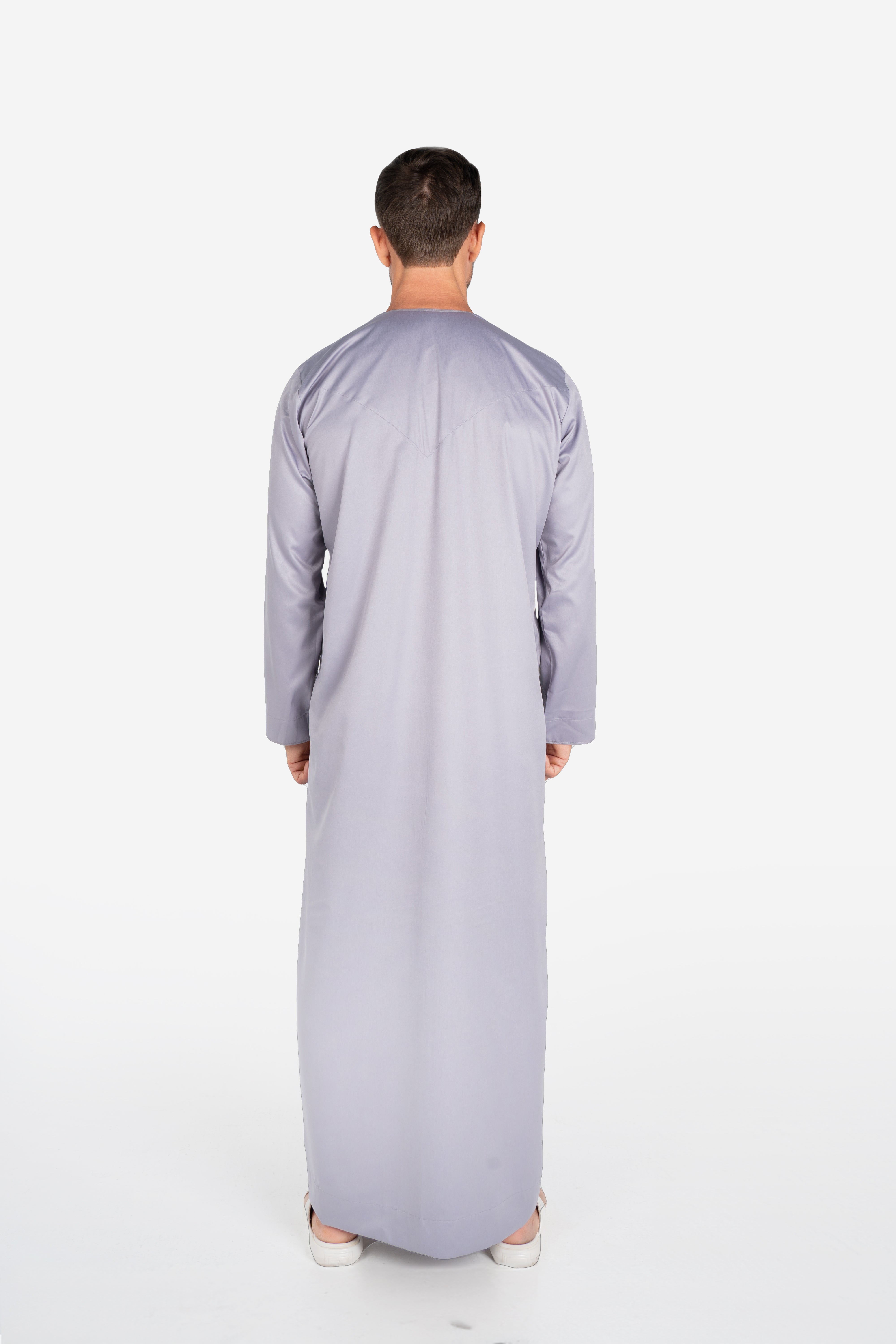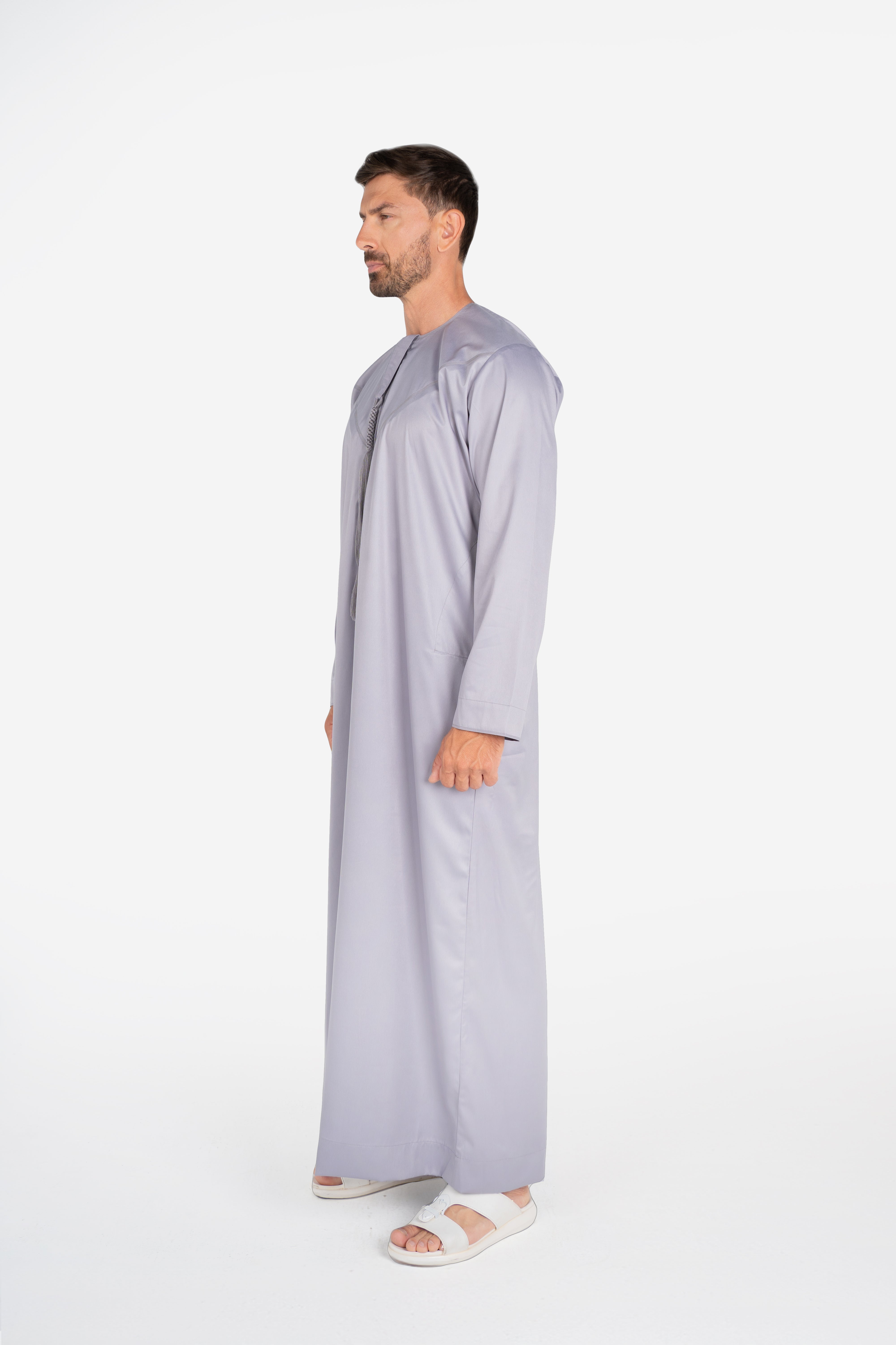 Exude timeless elegance with the Emirati Thobe in Grey. Made from a luxurious shiny fabric, this thobe combines traditional Emirati design with a sophisticated sheen.