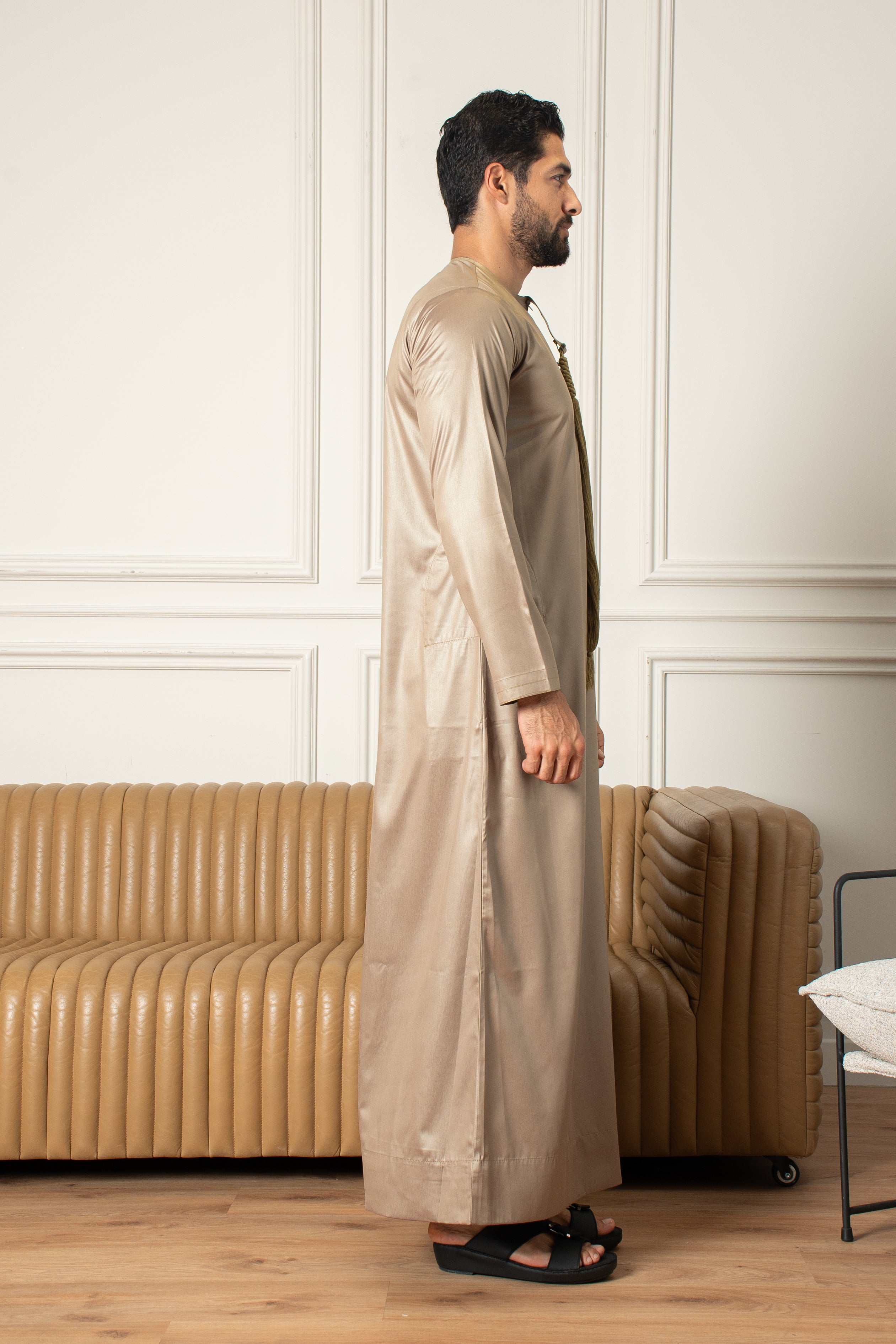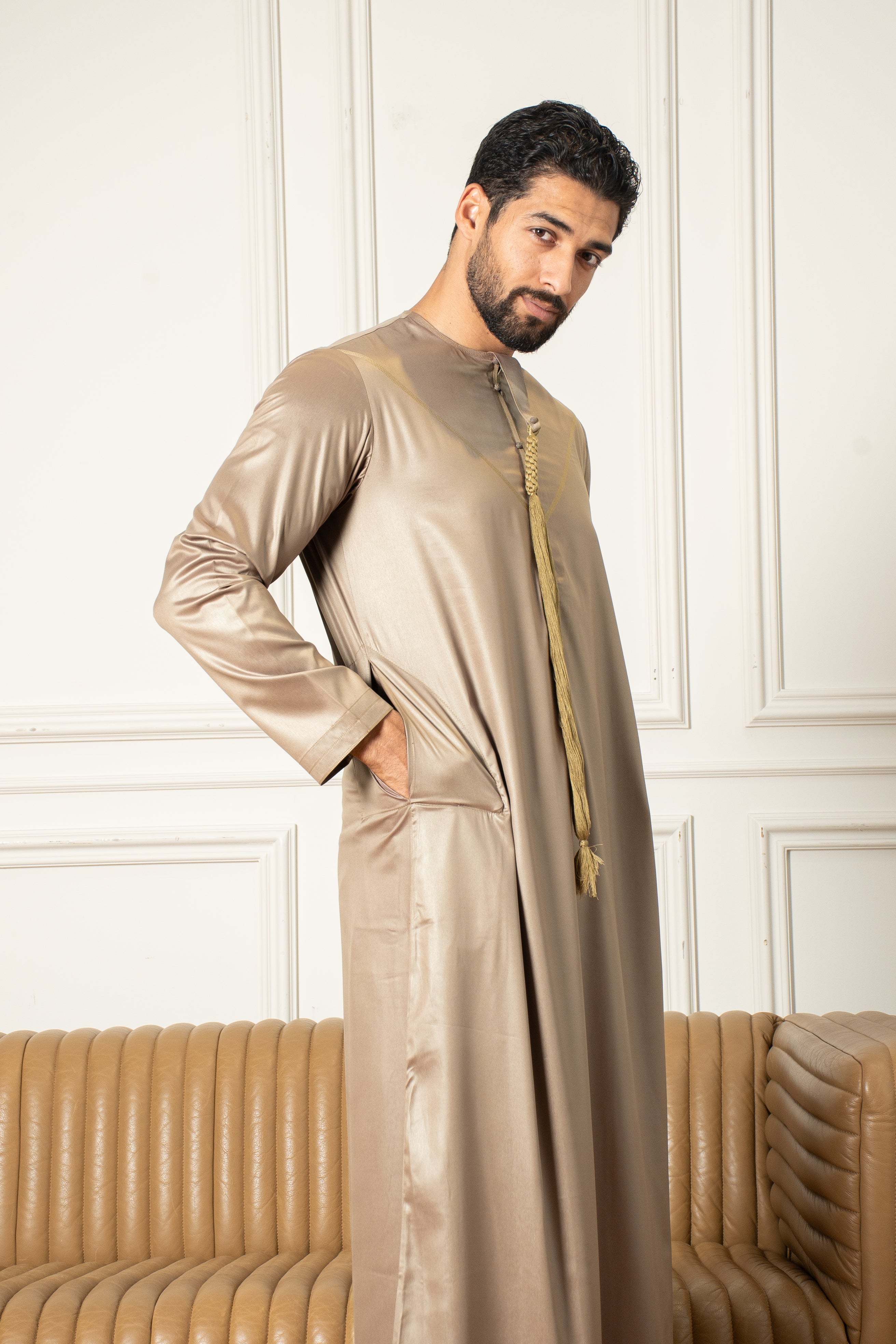 Exude timeless elegance with the Emirati Thobe in Arabian Bronze. Made from a luxurious shiny fabric, this thobe combines traditional Emirati design with a sophisticated sheen.Β