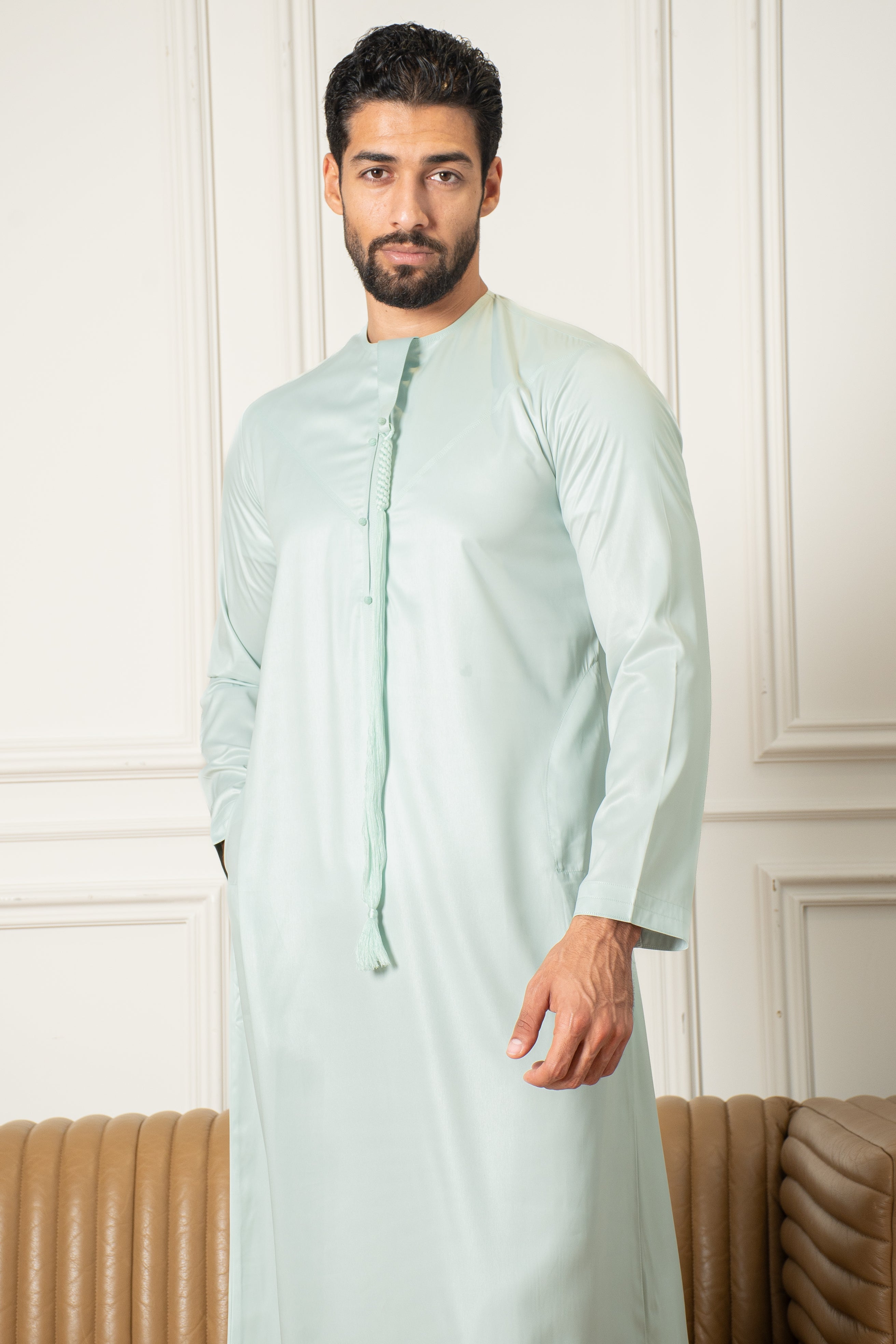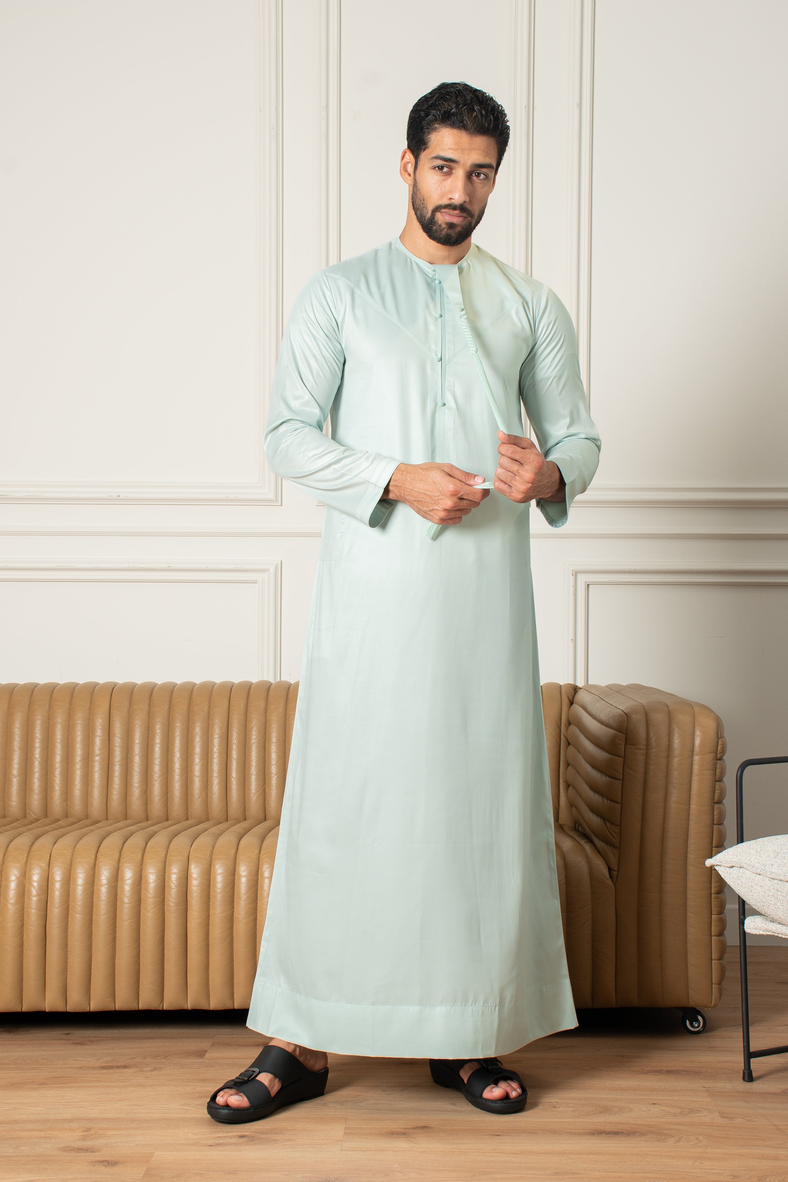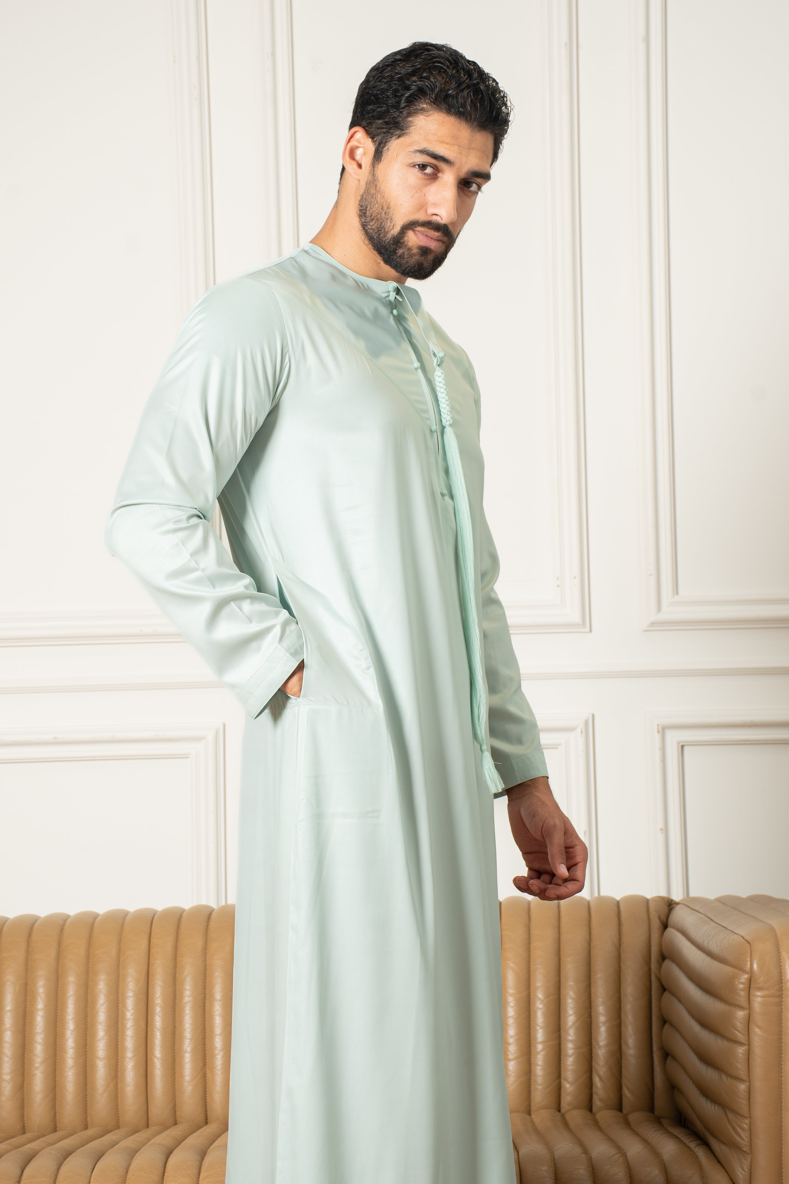 Exude timeless elegance with the Emirati Thobe in Glacier Green. Made from a luxurious shiny fabric, this thobe combines traditional Emirati design with a sophisticated sheen.Β