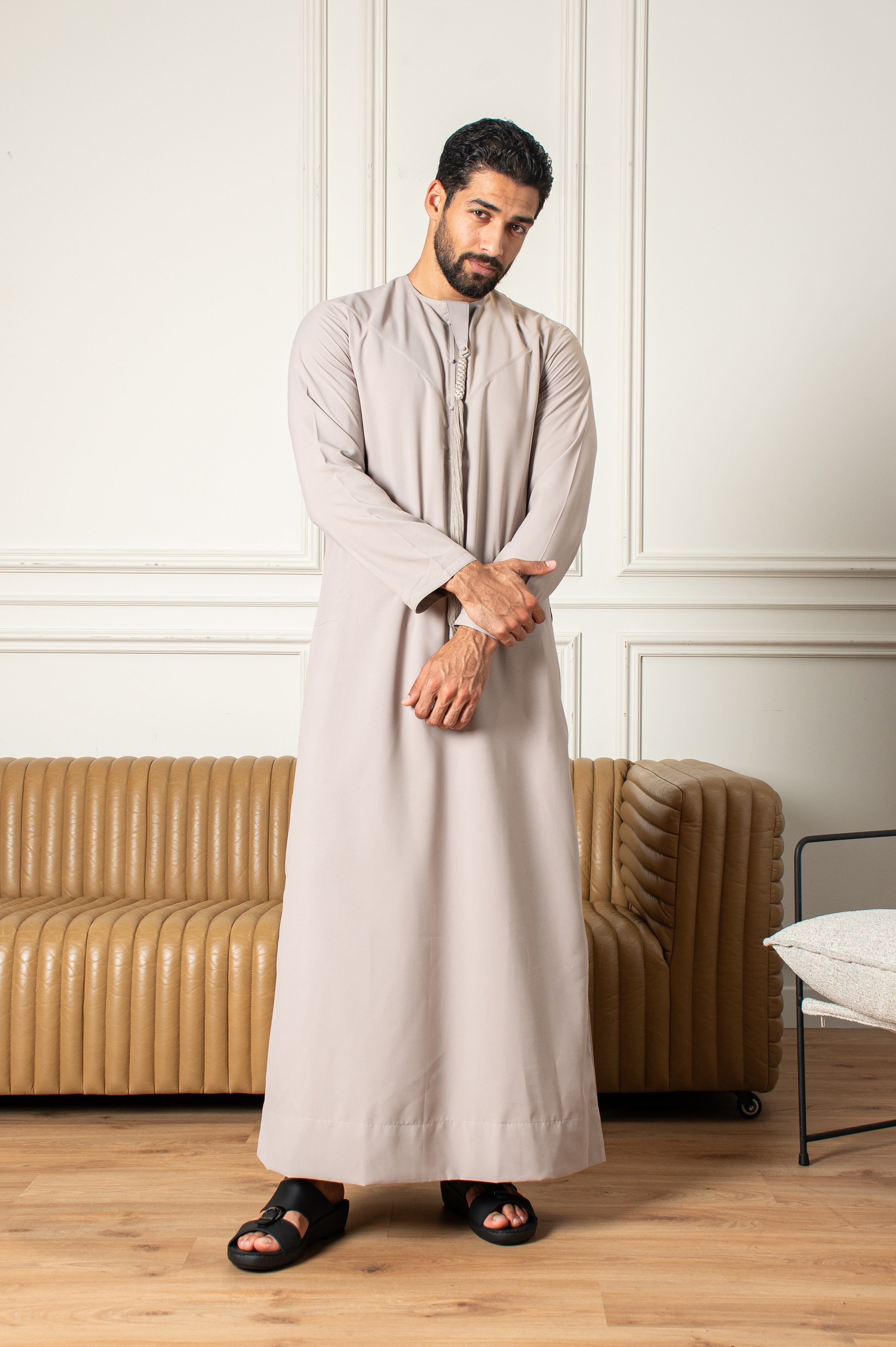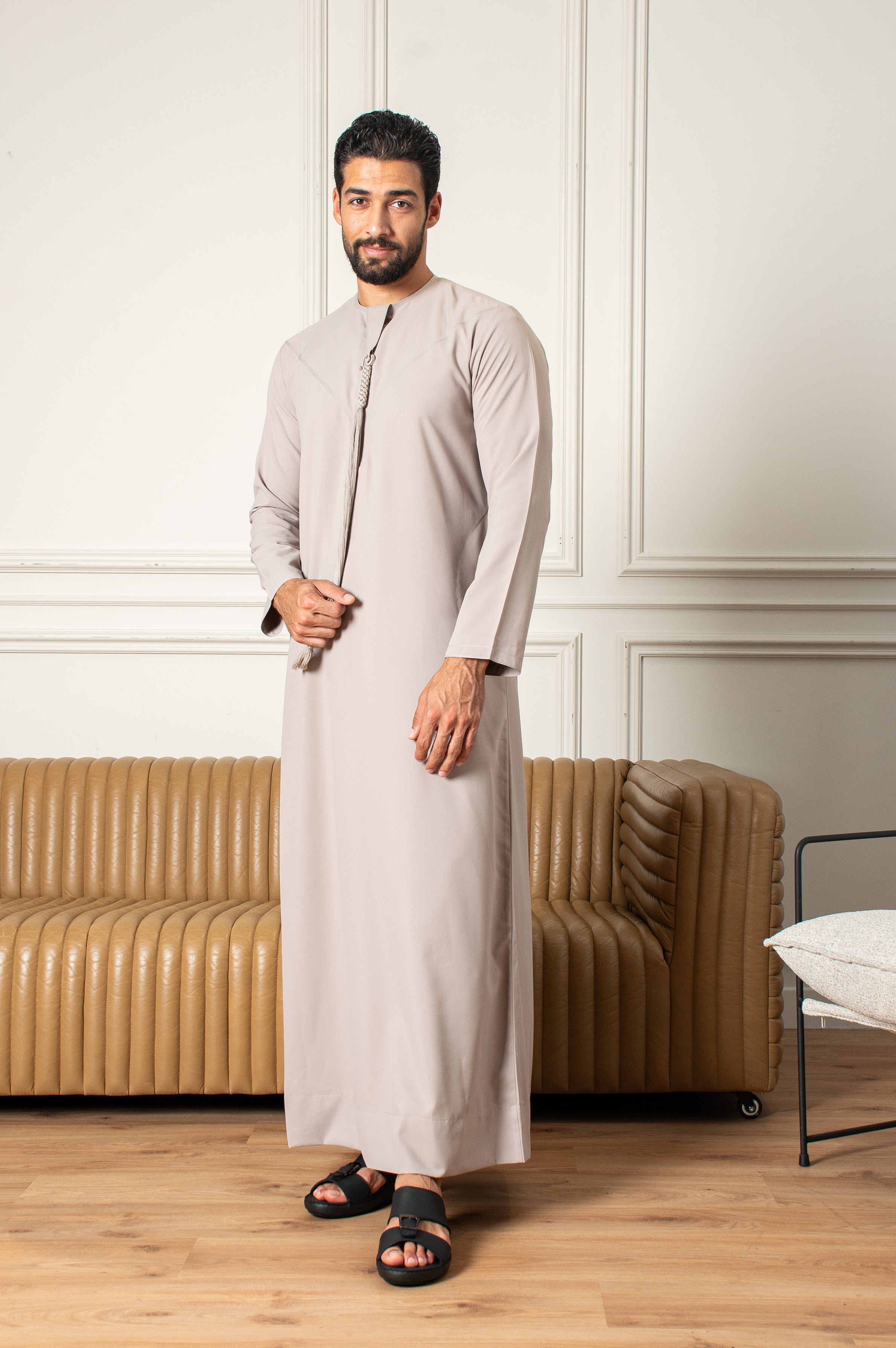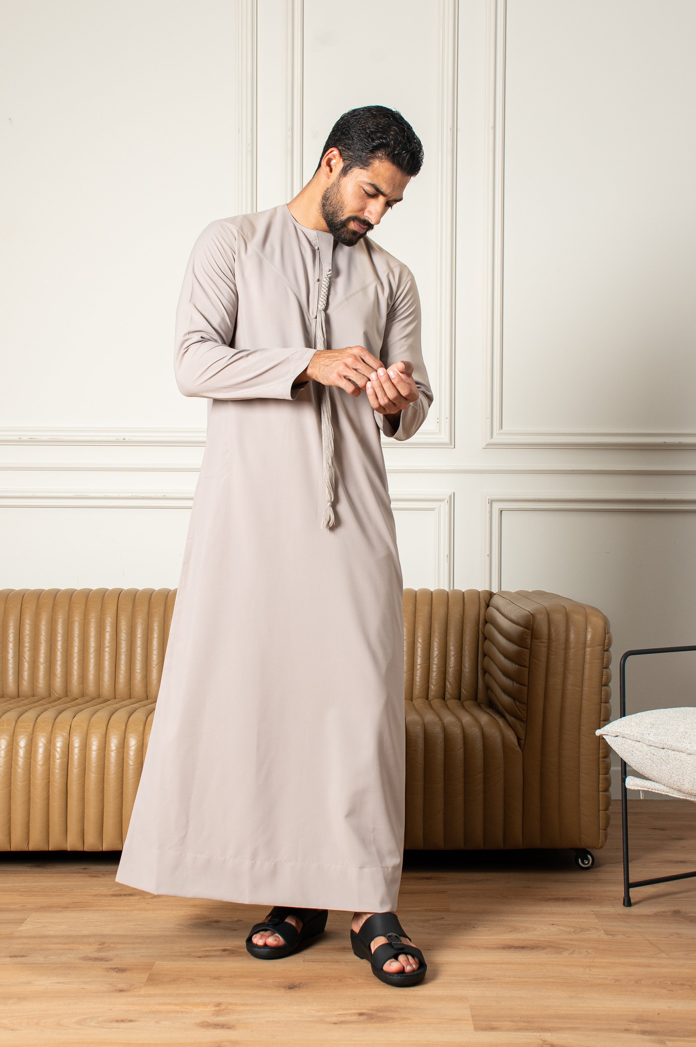 Elevate your wardrobe with the understated elegance of the Essentials Emirati Thobe in Desert Taupe. Crafted for comfort and designed for timeless style, this thobe is a perfect blend of traditional Emirati craftsmanship and modern simplicity. The soft, breathable fabric ensures you stay cool and comfortable throughout the day.