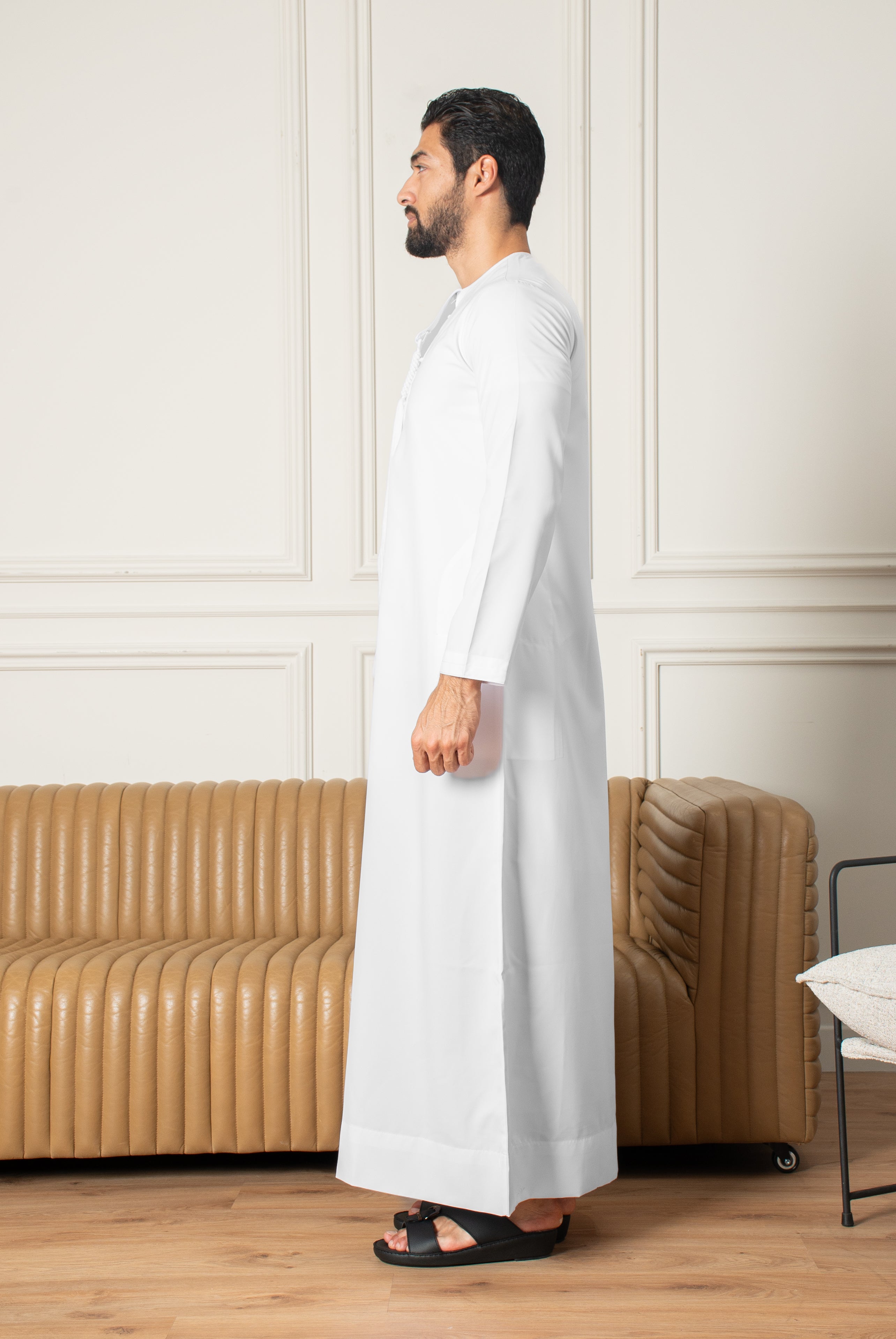 Embrace a new level of refined simplicity with the Essentials Emirati Thobe – a wardrobe essential that speaks to tradition while celebrating contemporary style.