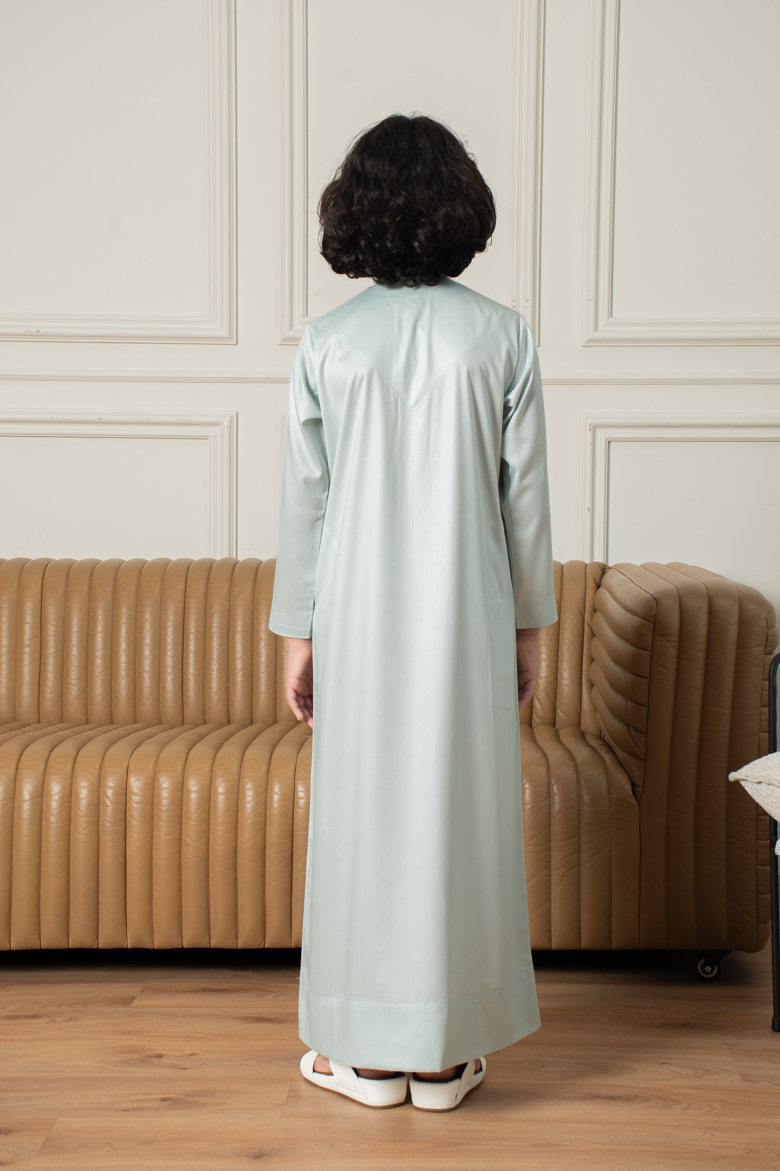 Exude timeless elegance with the Emirati Thobe in Glacier Green. Made from a luxurious shiny fabric, this thobe combines traditional Emirati design with a sophisticated sheen.
