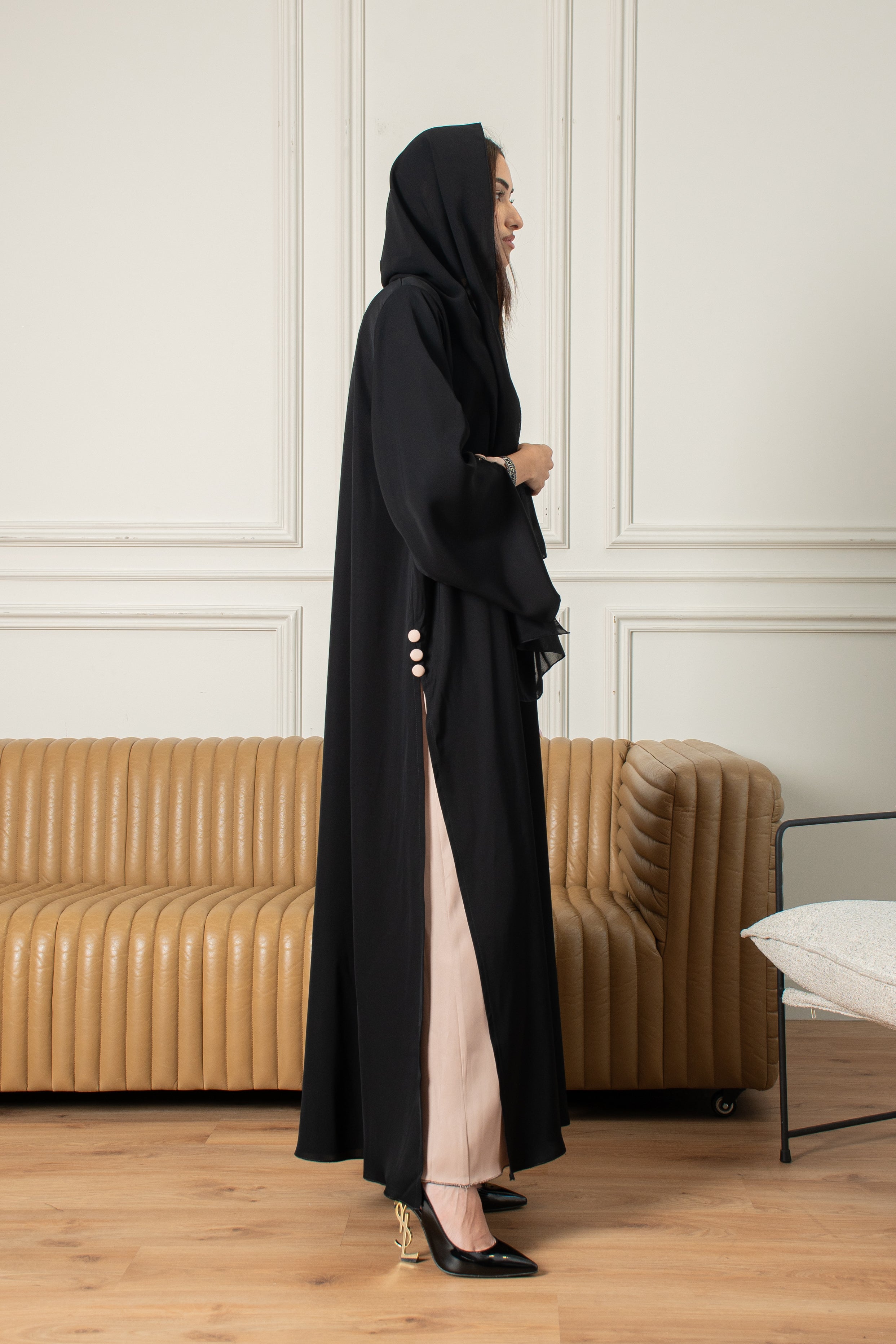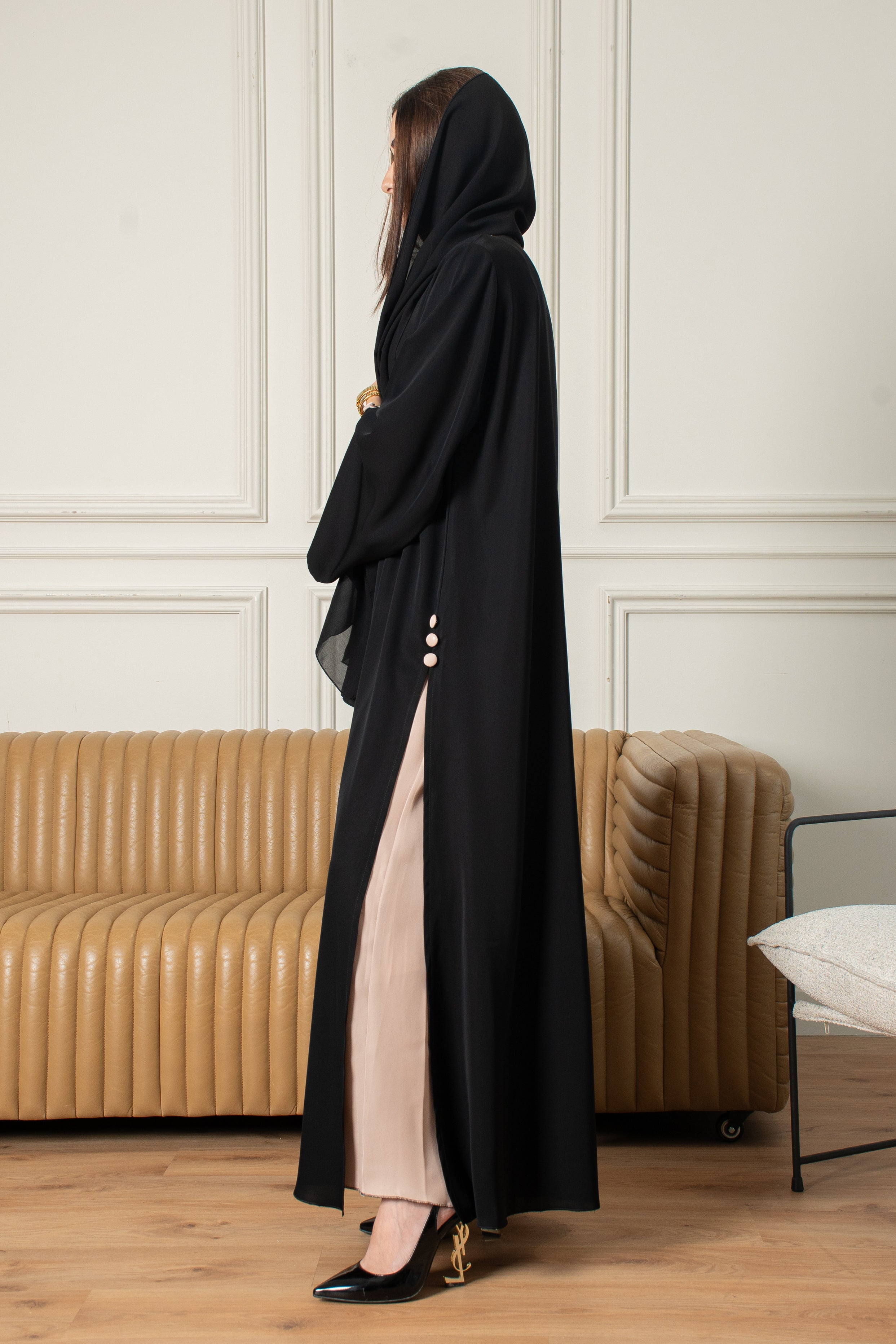 The Lunar Abaya is made from high-quality Korean fabric. It comes with a matching black scarf. The abaya has side slits with beige accents that peek through, and there are beige buttons on the sleeves and sides. It’s easy to wear and looks good for everyday wear.