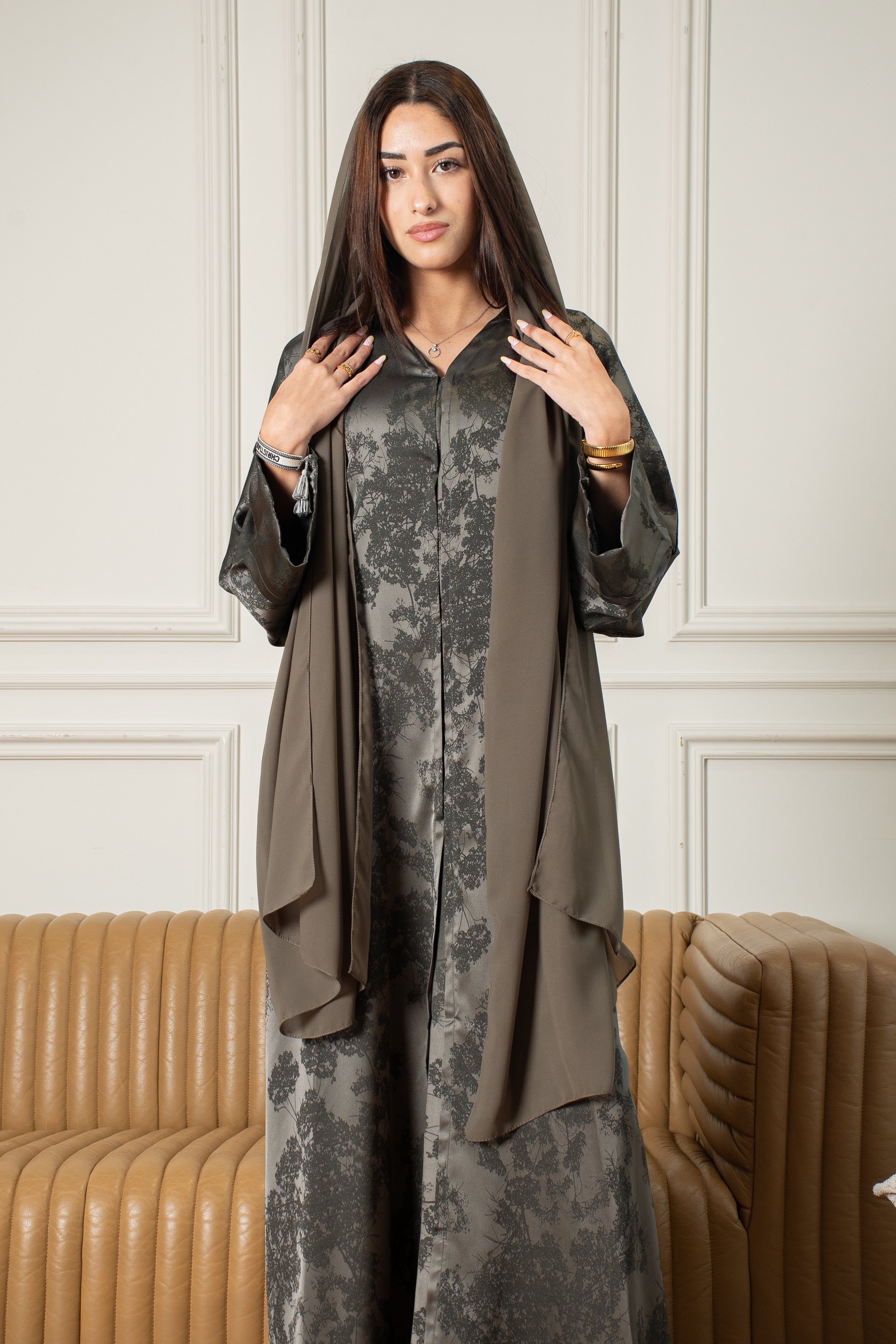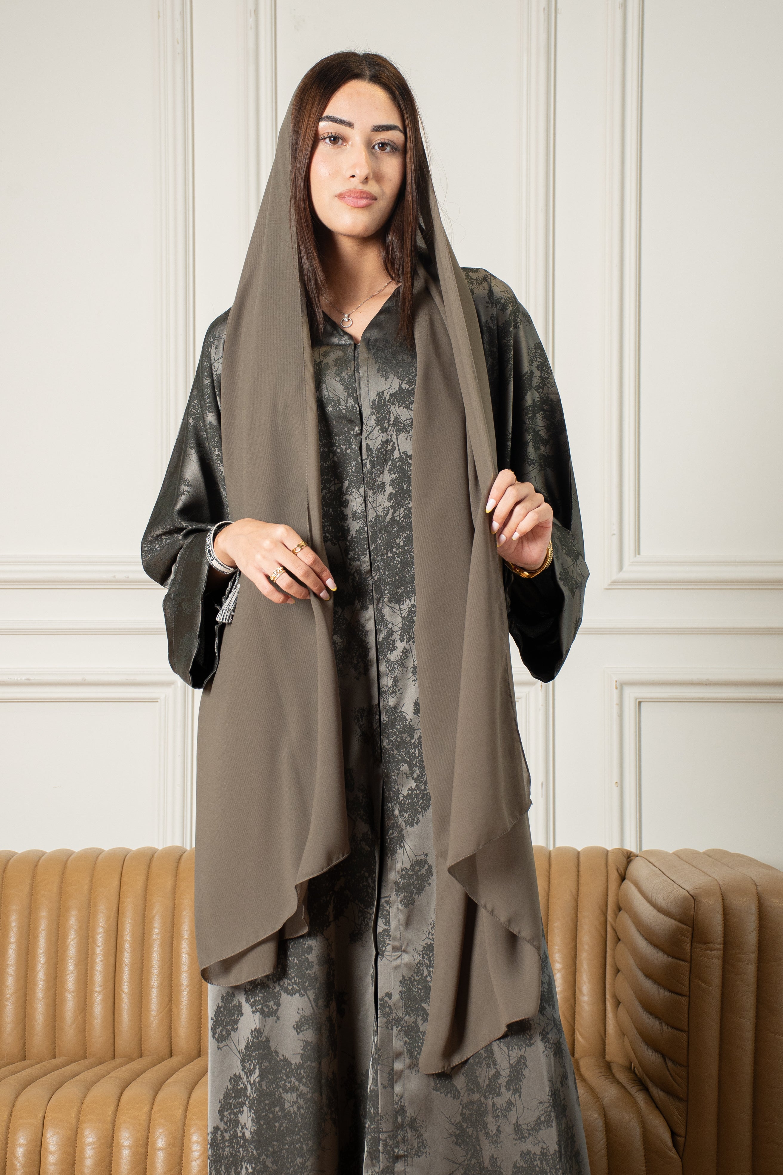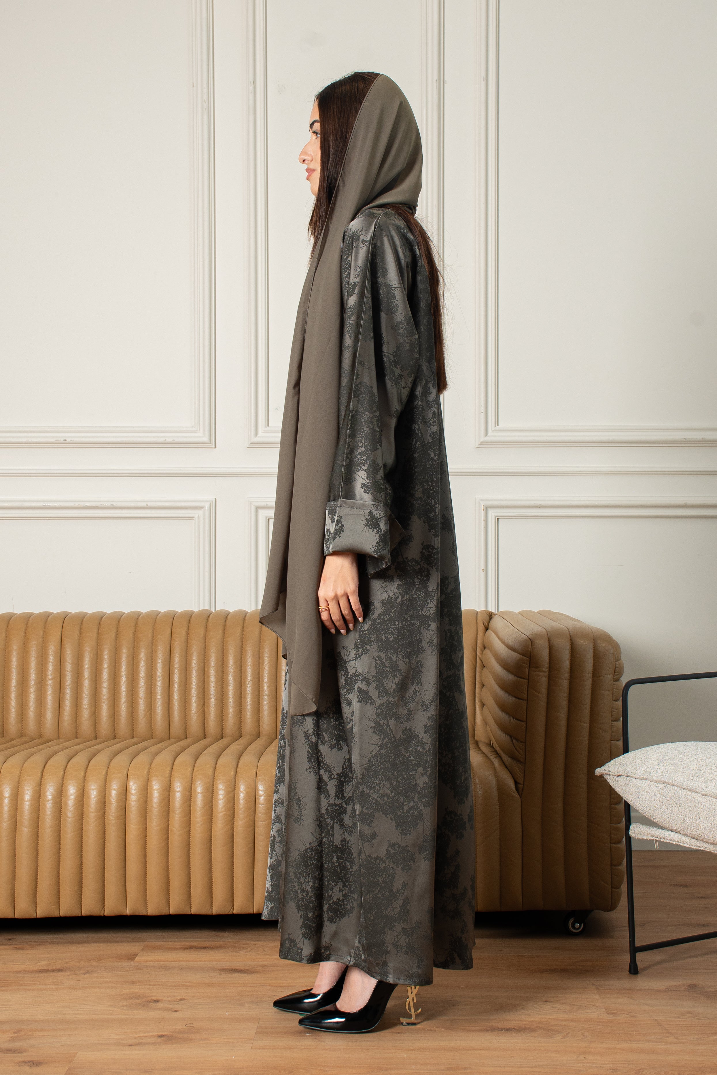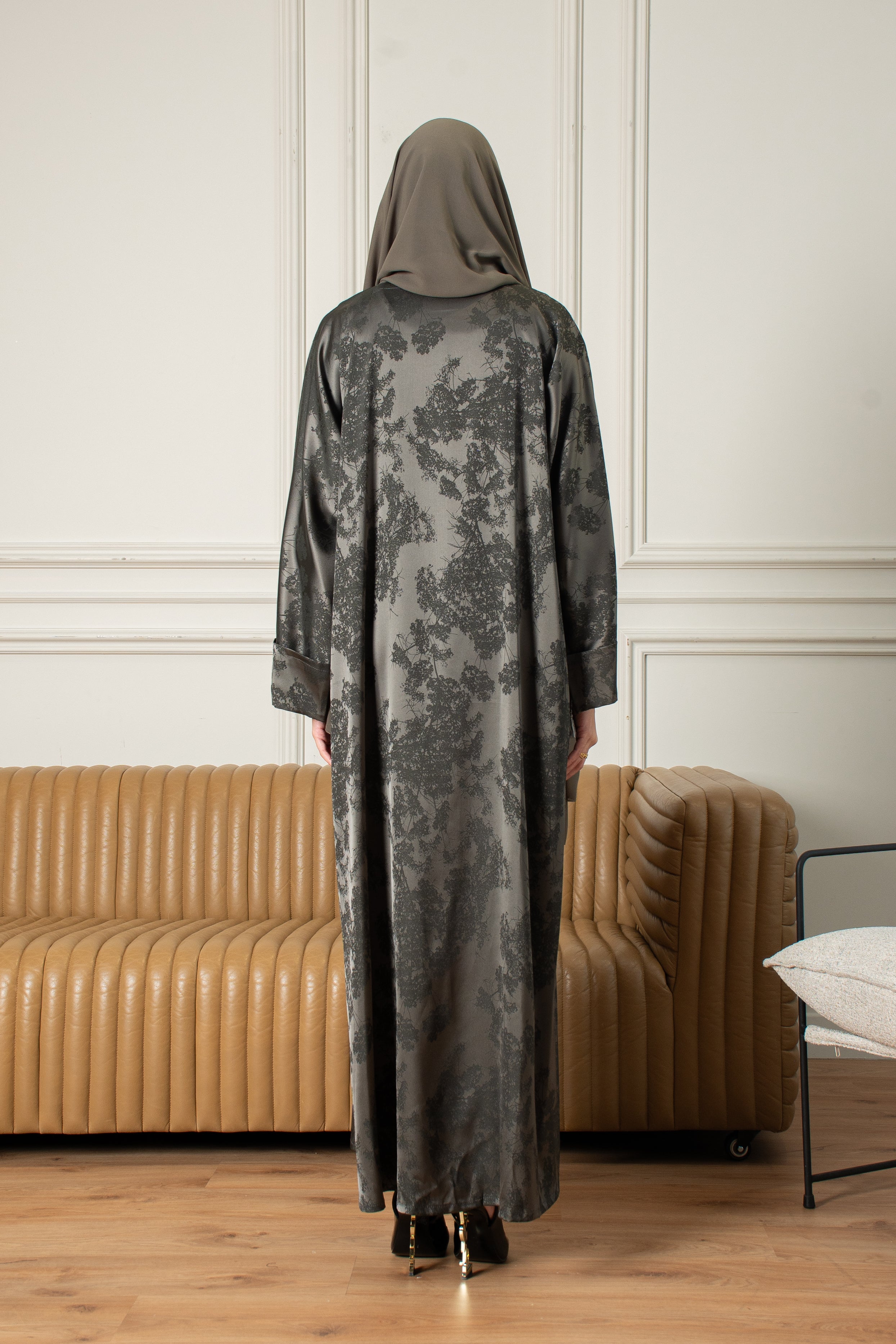The Midnight Petal Abaya in Grey is a nice mix of style and comfort. This 2-piece set includes the abaya and a matching scarf. Itβs perfect for everyday wear or special events. The dark blue color looks elegant, and the pretty floral print adds a nice touch. The flowy design makes it comfortable to wear all day.