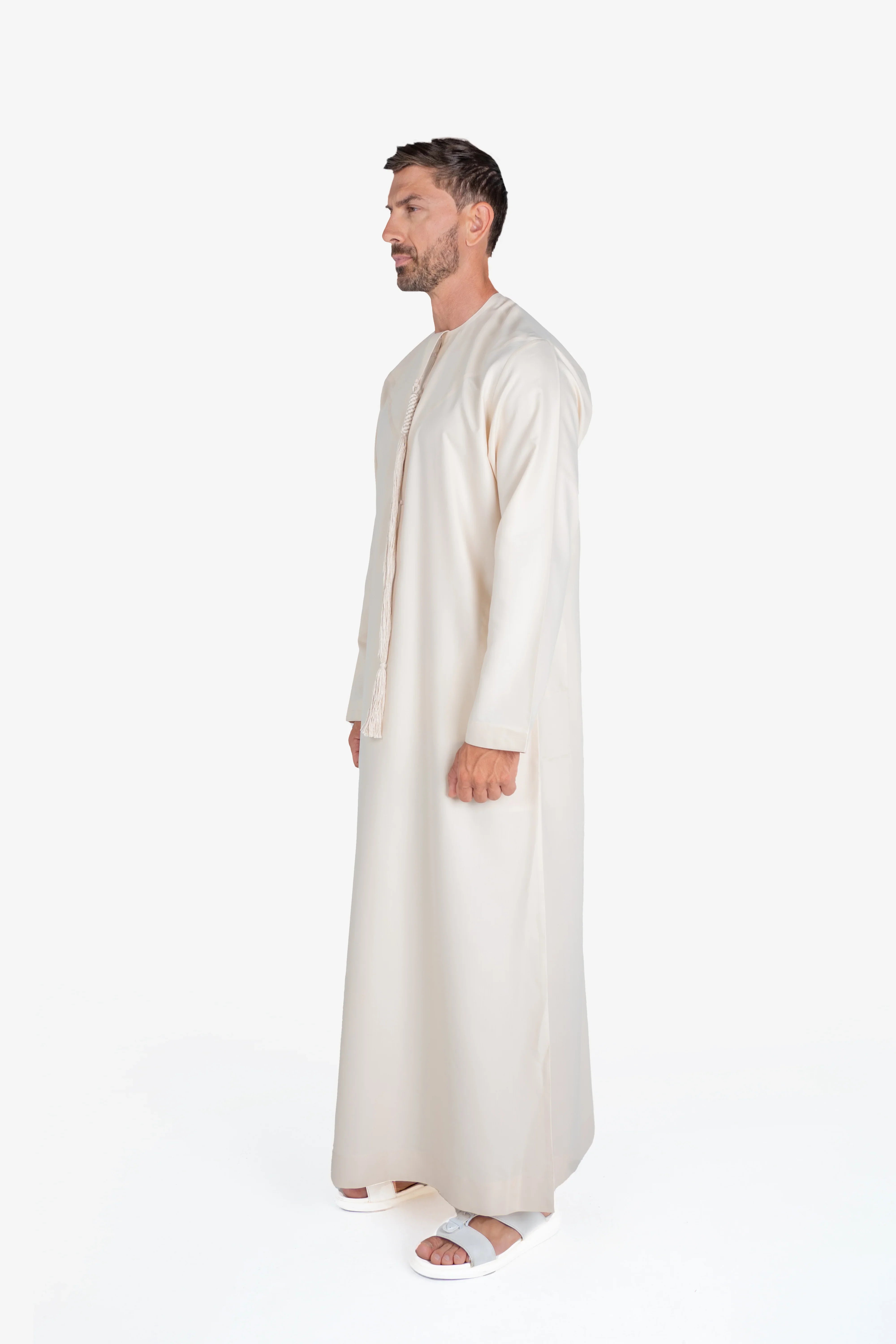 It features a removable tarboosh for easy customization and a round collar for a clean and classic look. Built to last with great attention to detail, the Davajo Gold is a great choice for those who want a well-made, traditional kandura with a modern touch.