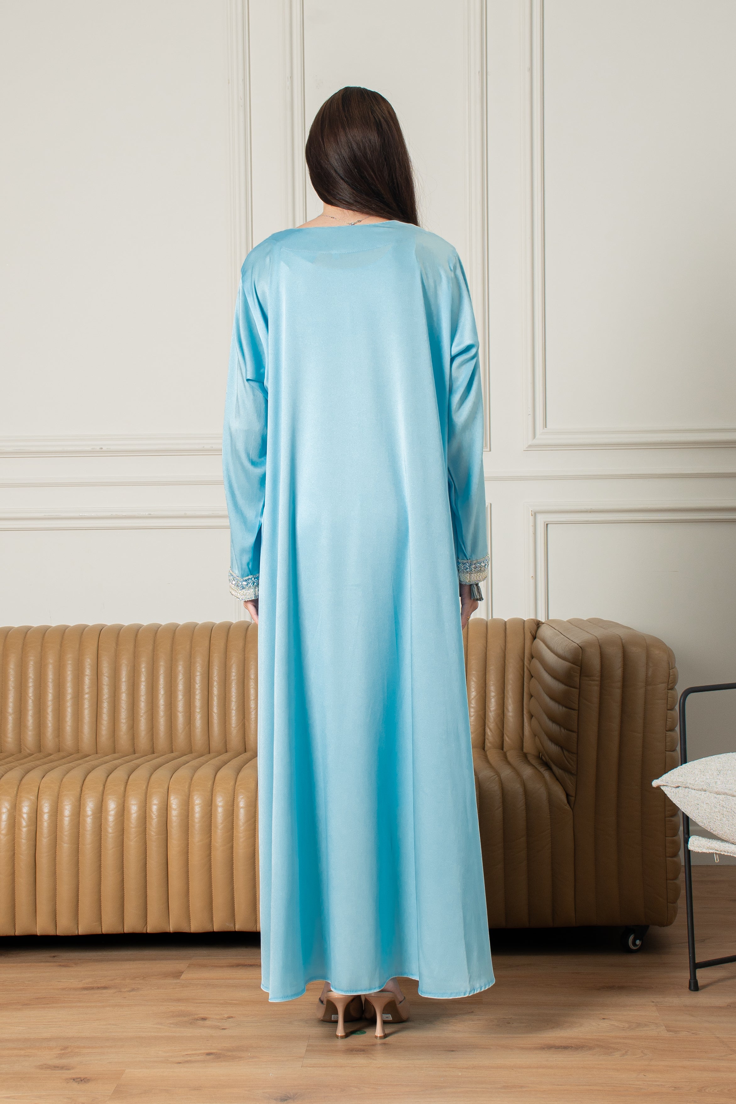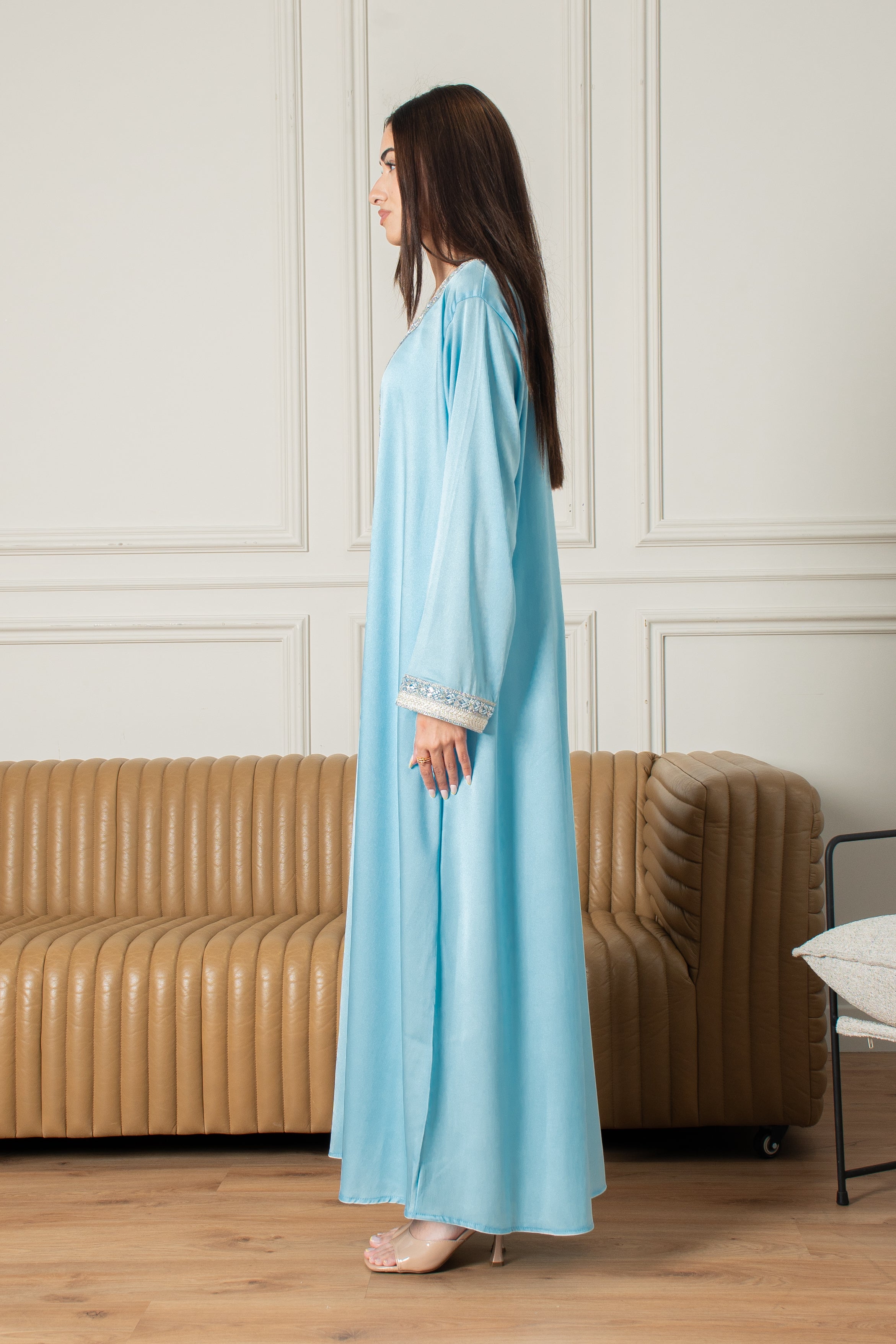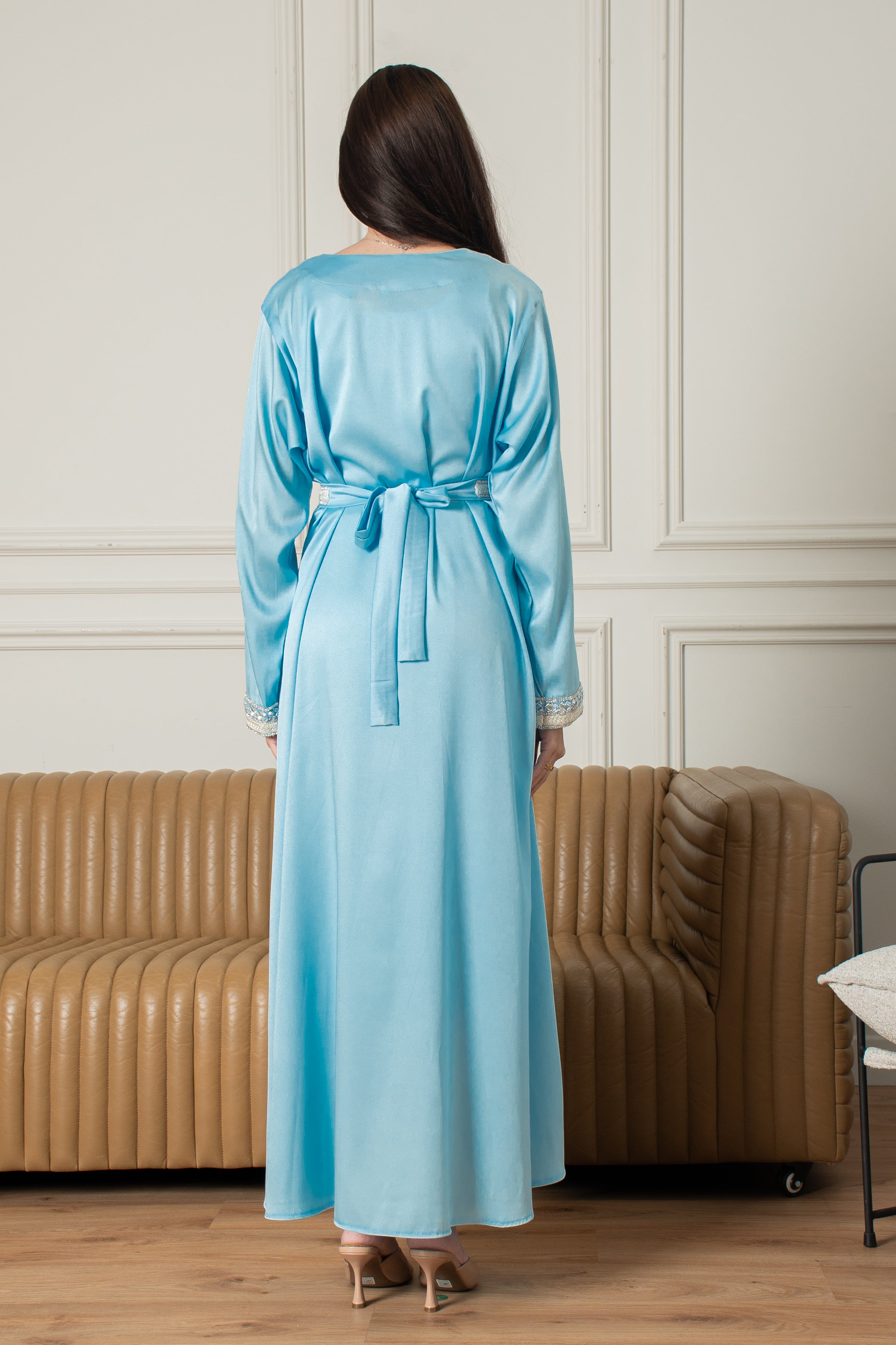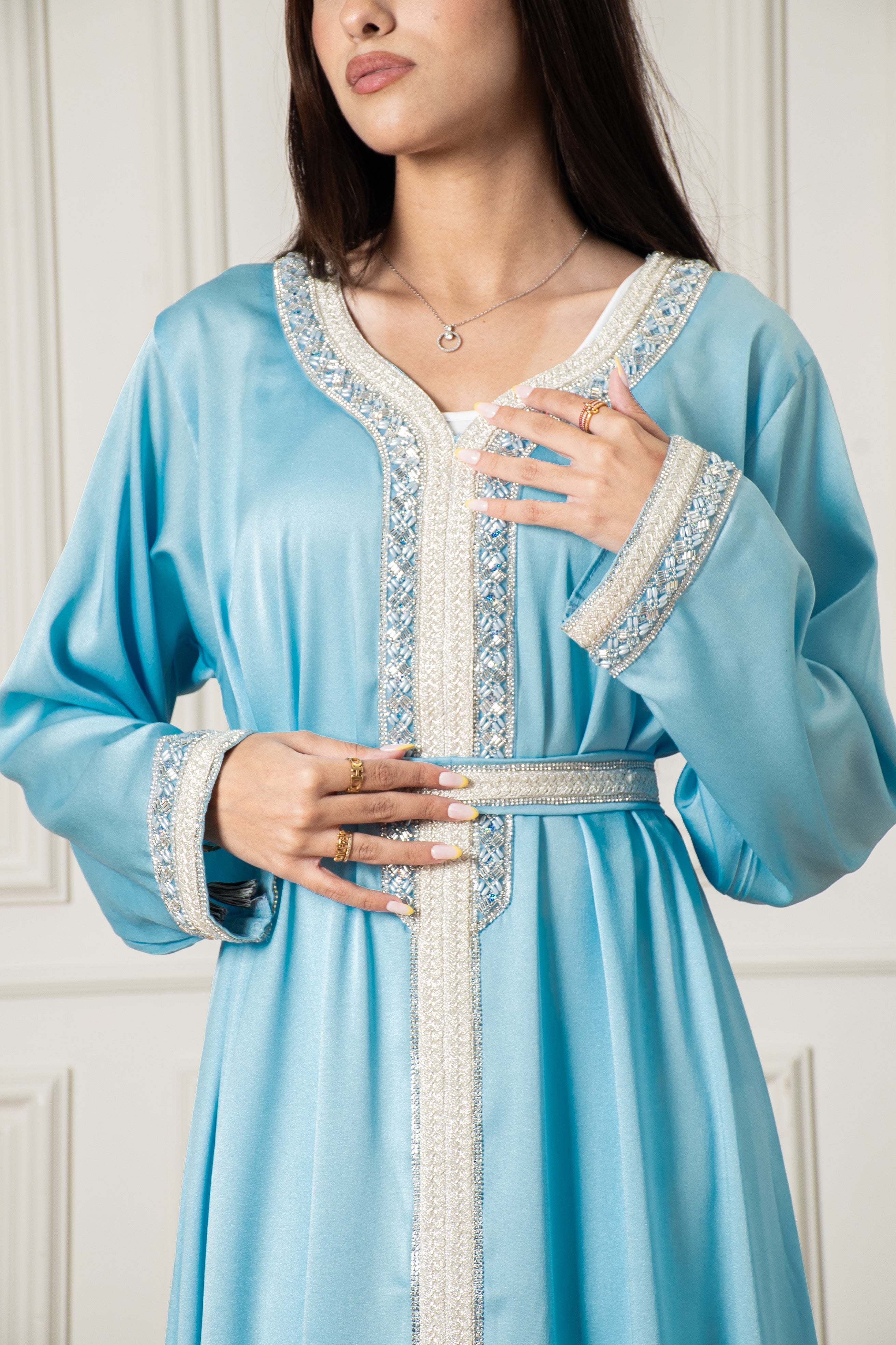 The Yasmine Djellaba is a two-piece Moroccan set thatβs easy to wear and perfect for special occasions, featuring simple embroidery on the front and sleeves in a soft Baby Blue colour. It comes with a belt that you can wear for a fitted look or leave off for a more relaxed style.