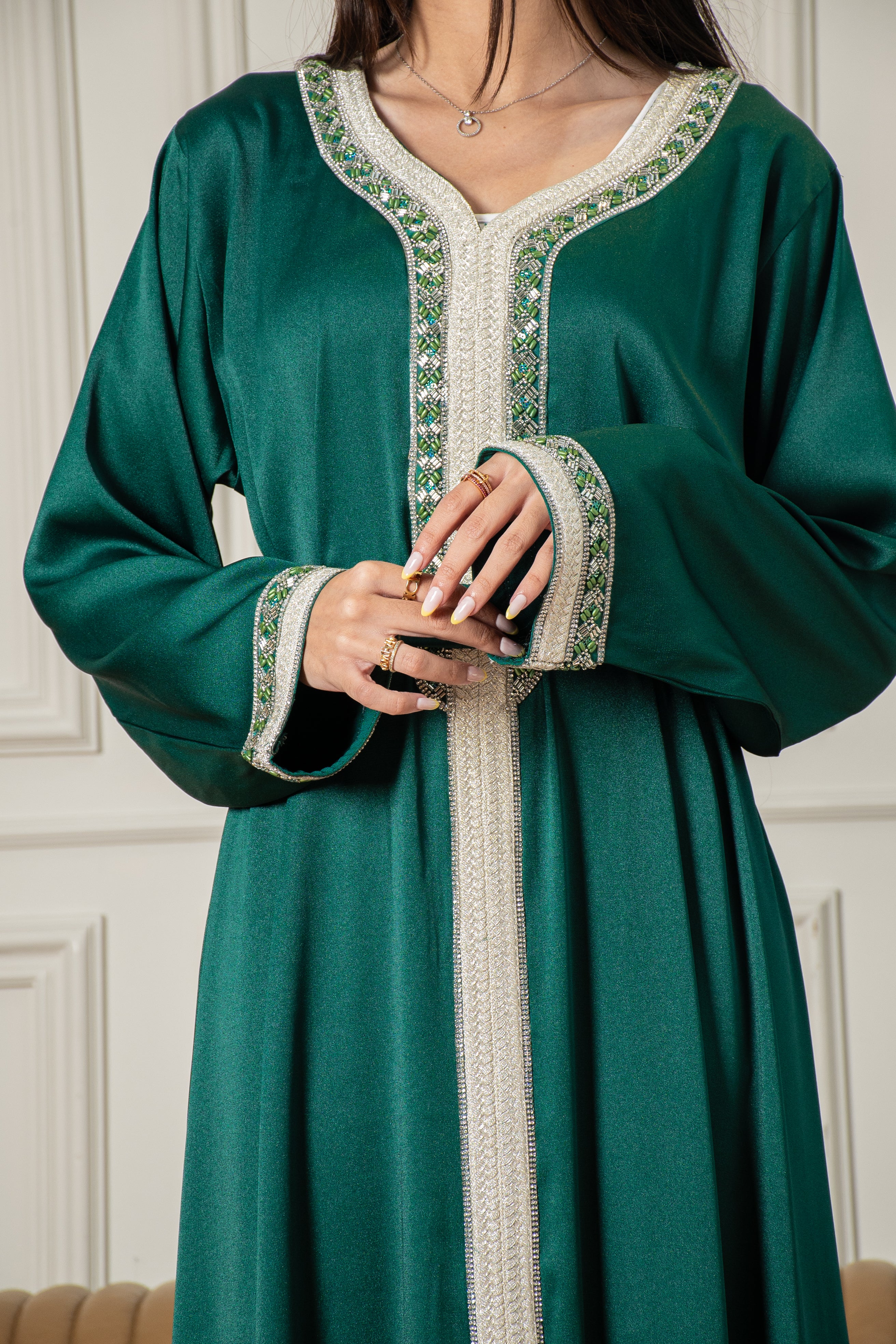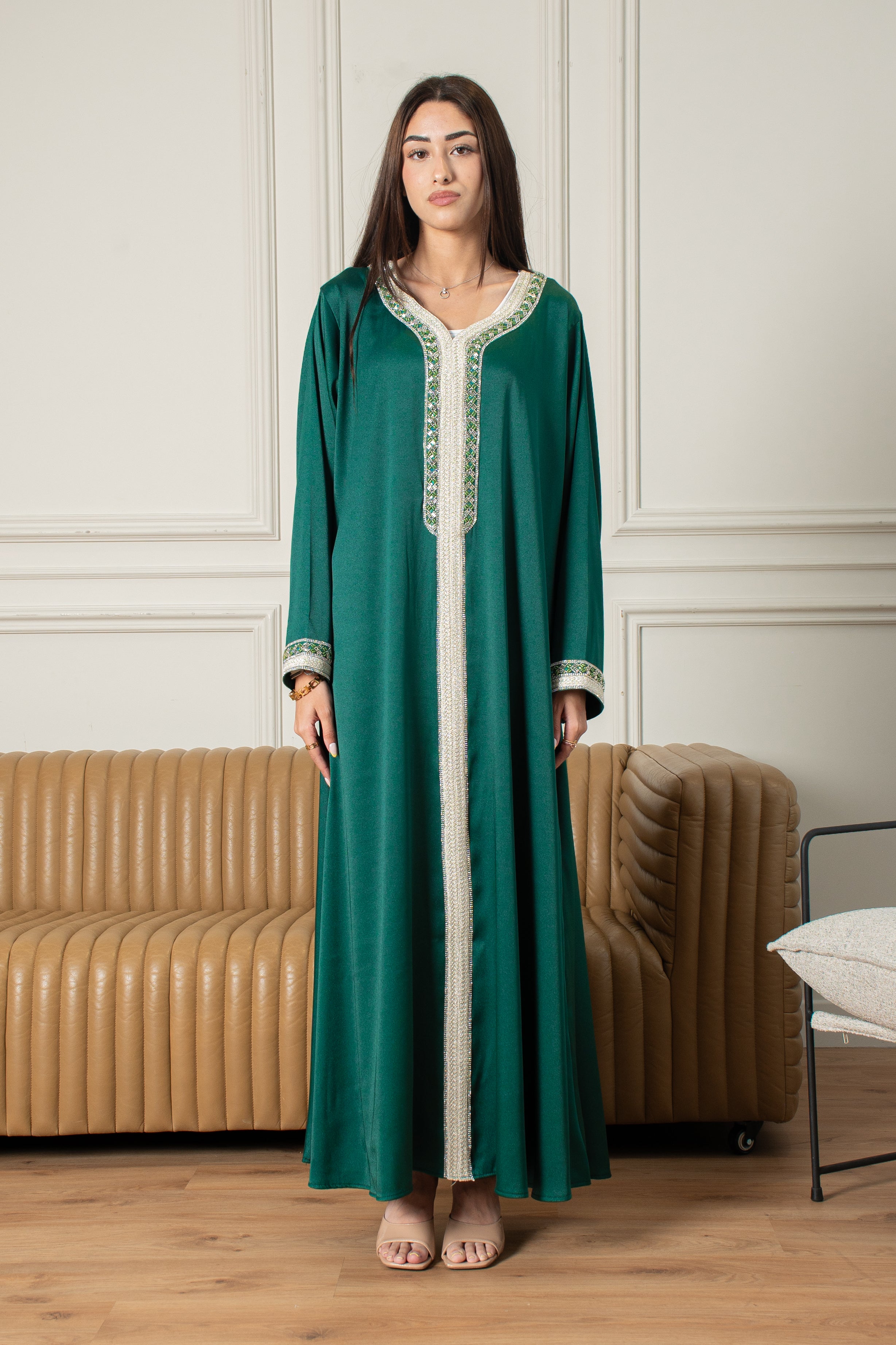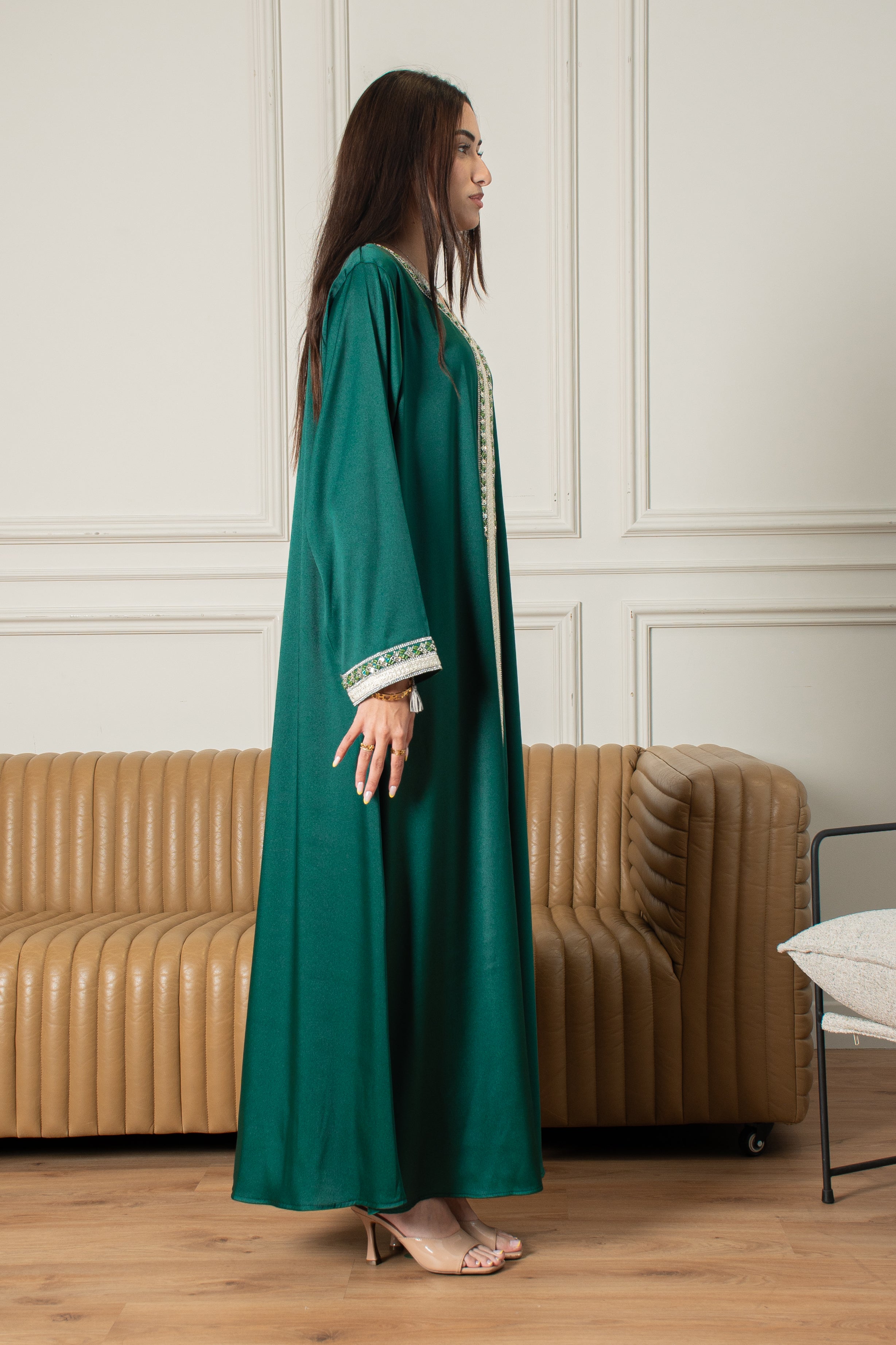 The Yasmine Djellaba is a two-piece Moroccan set that’s easy to wear and perfect for special occasions, featuring simple embroidery on the front and sleeves in a soft Emerald Green colour. It comes with a belt that you can wear for a fitted look or leave off for a more relaxed style.