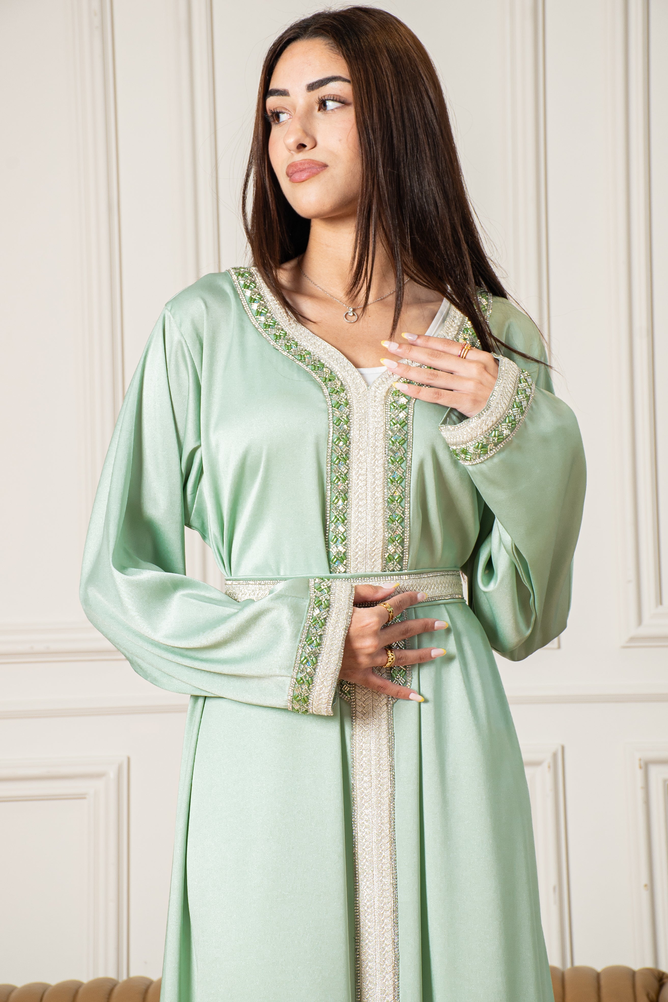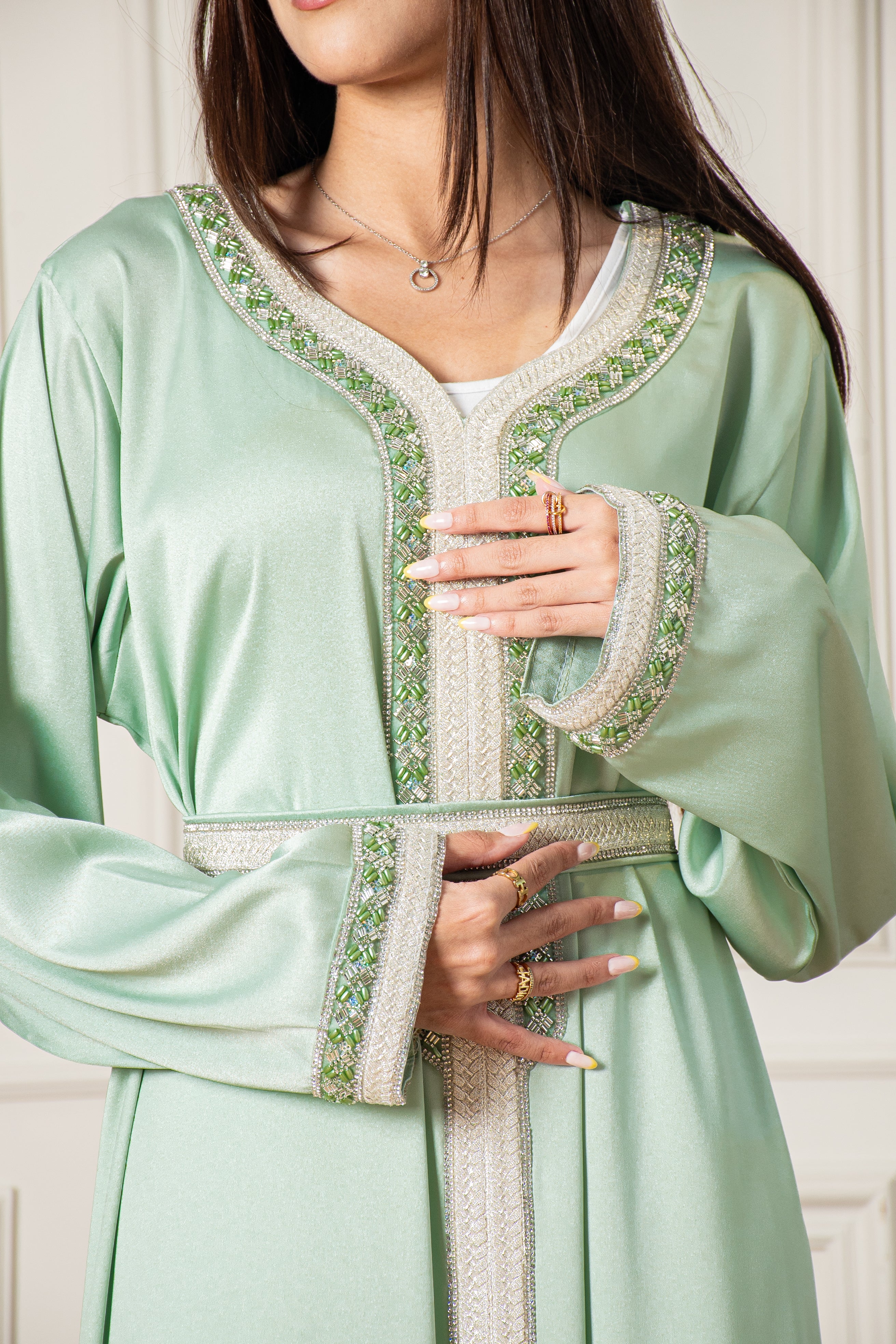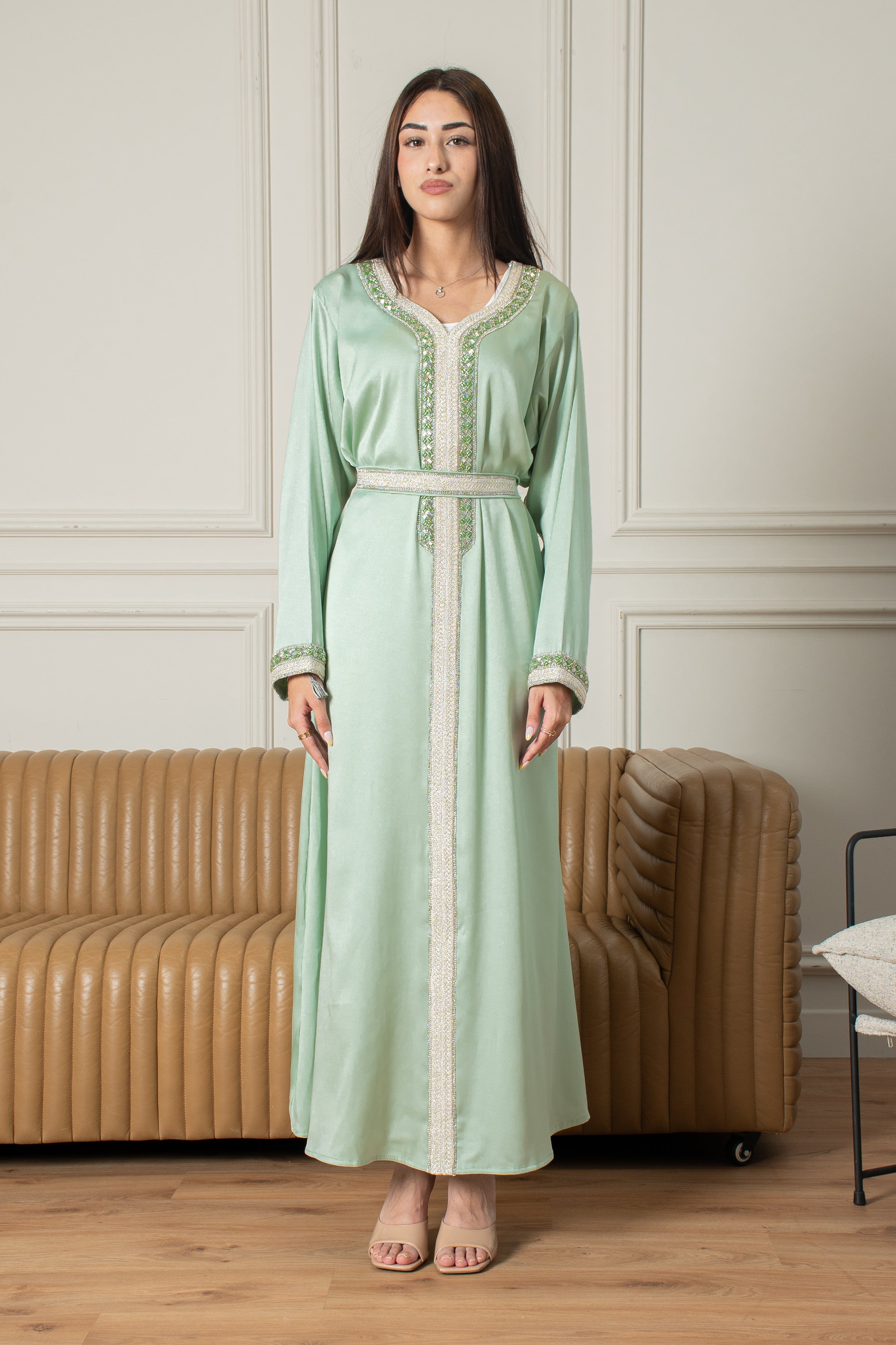 The Yasmine Djellaba is a two-piece Moroccan set thatβs easy to wear and perfect for special occasions, featuring simple embroidery on the front and sleeves in a soft Mint Green colour. It comes with a belt that you can wear for a fitted look or leave off for a more relaxed style.